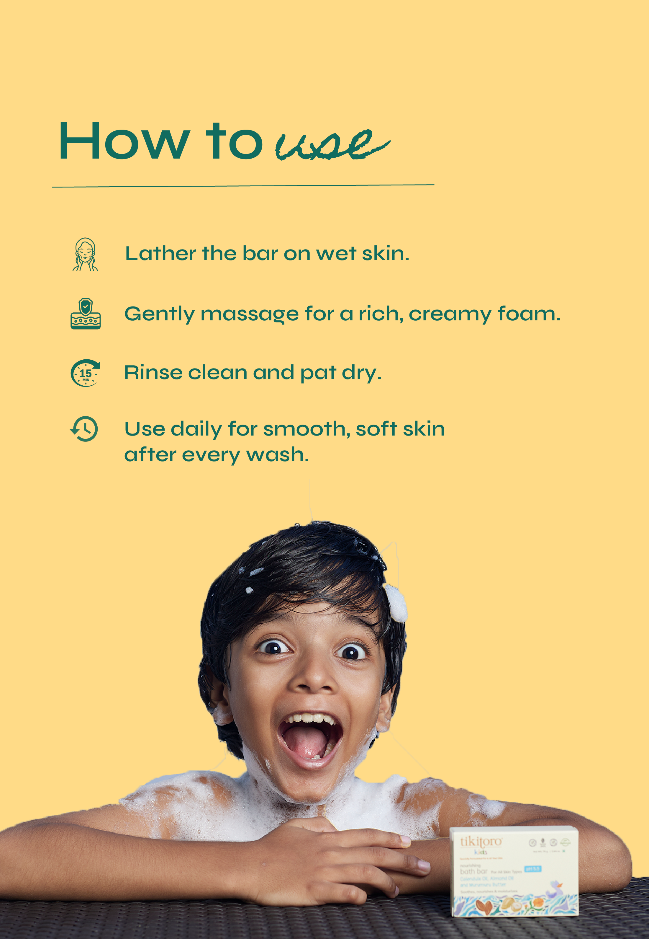 Pat dry and finish with a dollop of Tikitoro Kids Soothing Body Lotion for extra softness