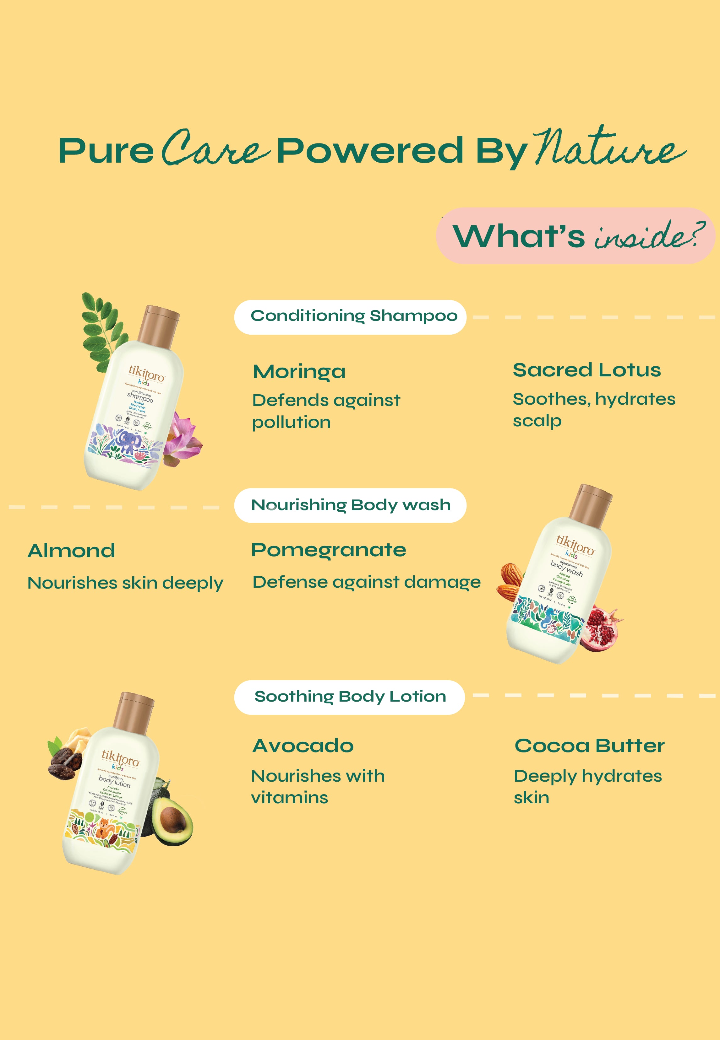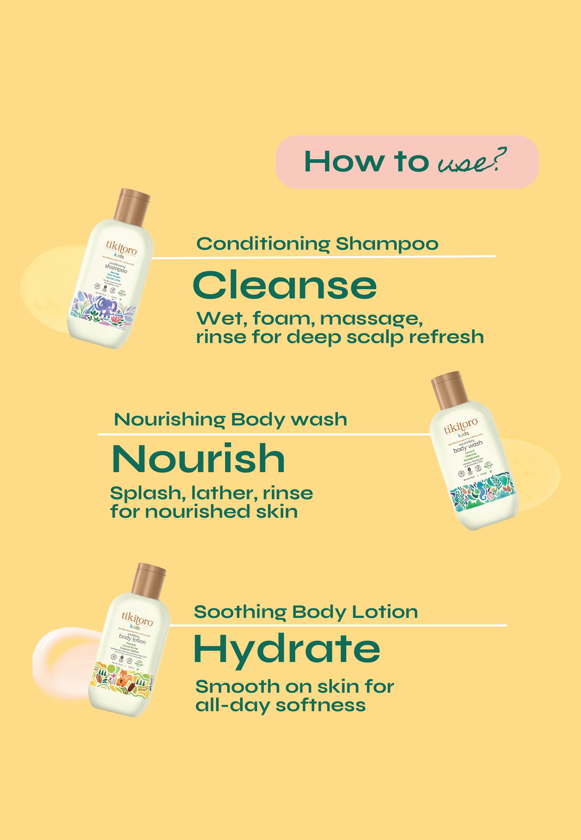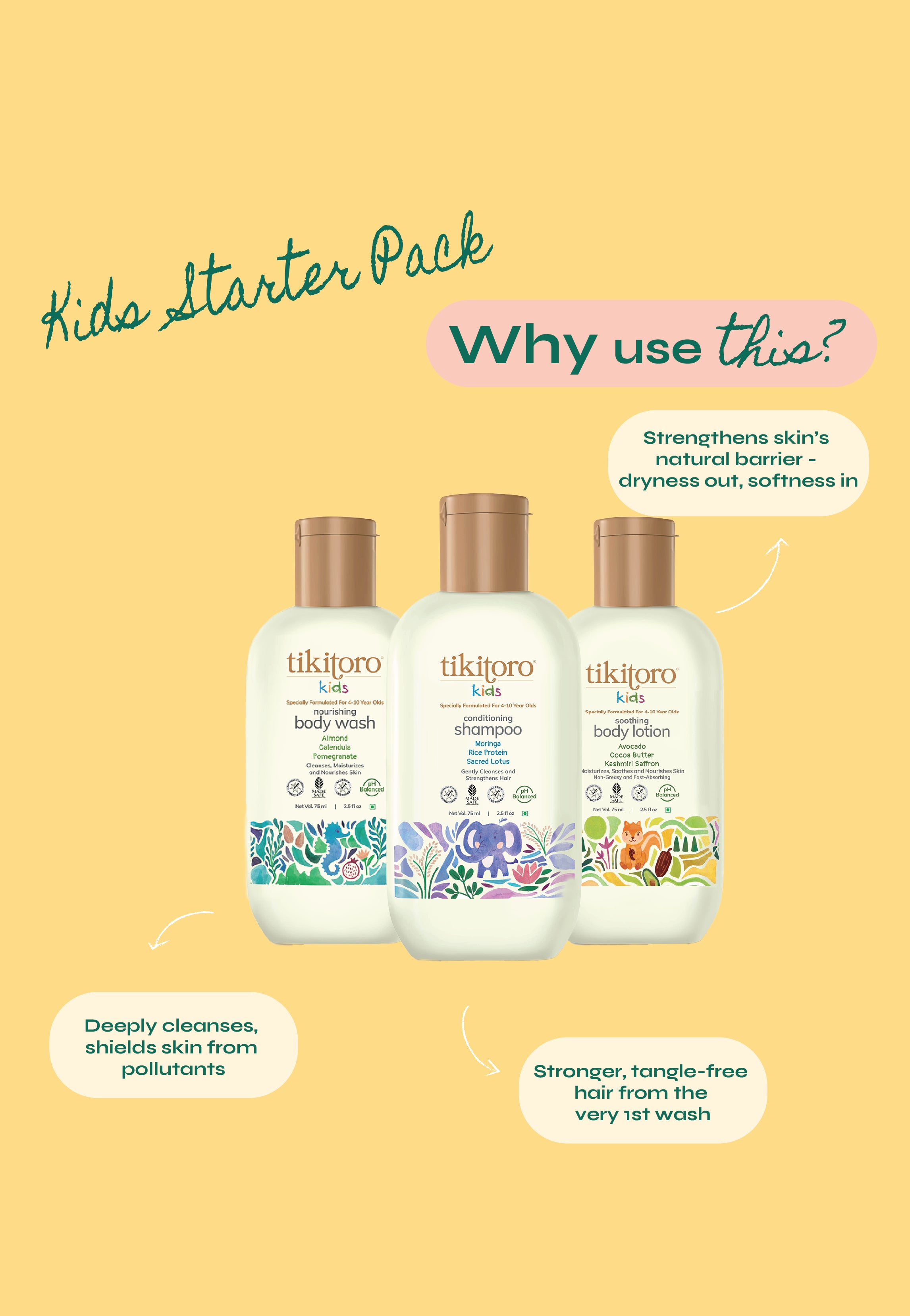 Meet the Tikitoro Kids Starter Pack, the perfect kick off for healthy hair and skin habits the fun way. This all-in-one kids skincare starter pack brings together our Kids Nourishing Body Wash with clinically proven hydration, Kids Conditioning Shampoo that delivers stronger hair from the very first wash, and Kids Soothing Body Lotion with clinically proven hydration, locks in moisture.