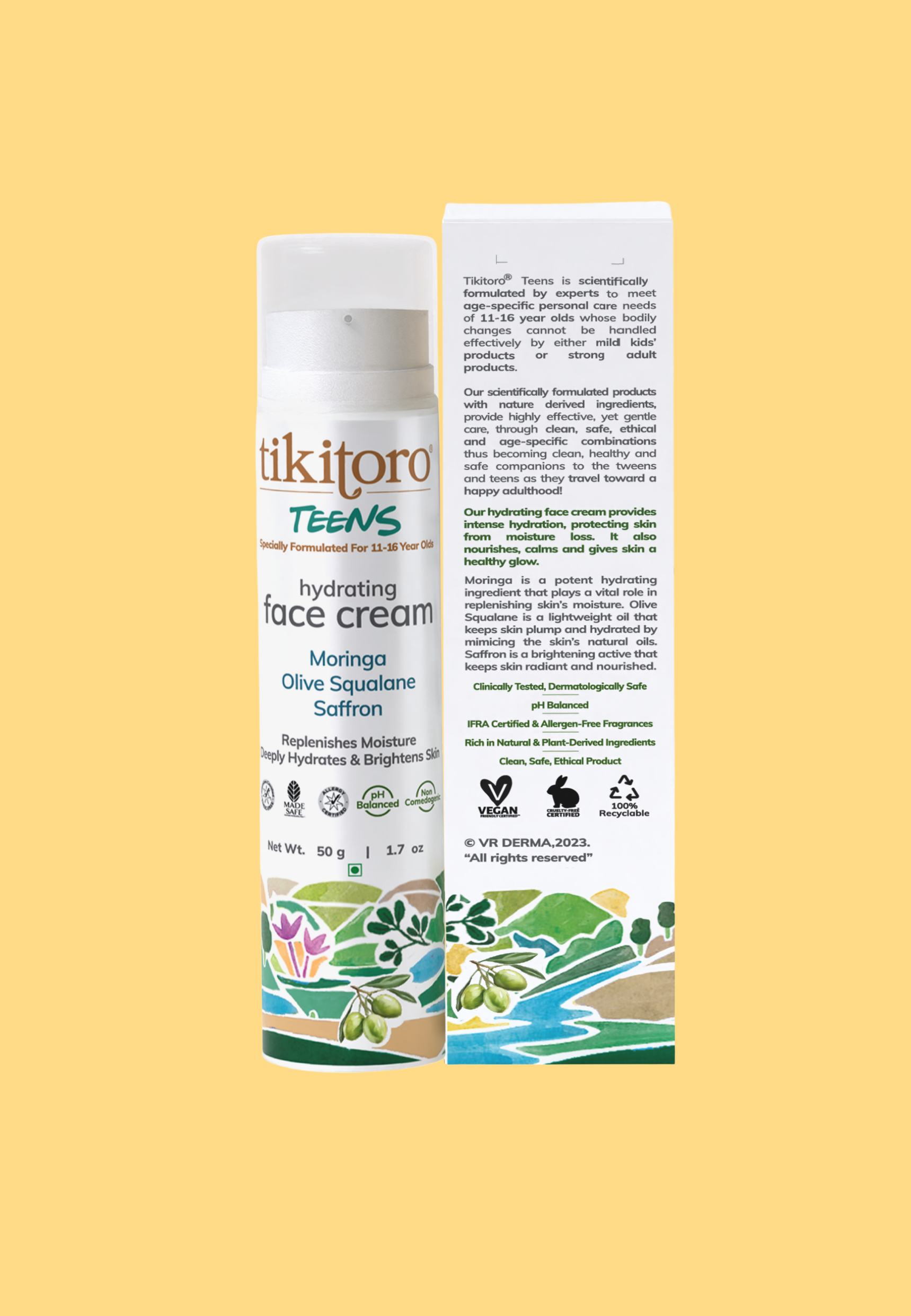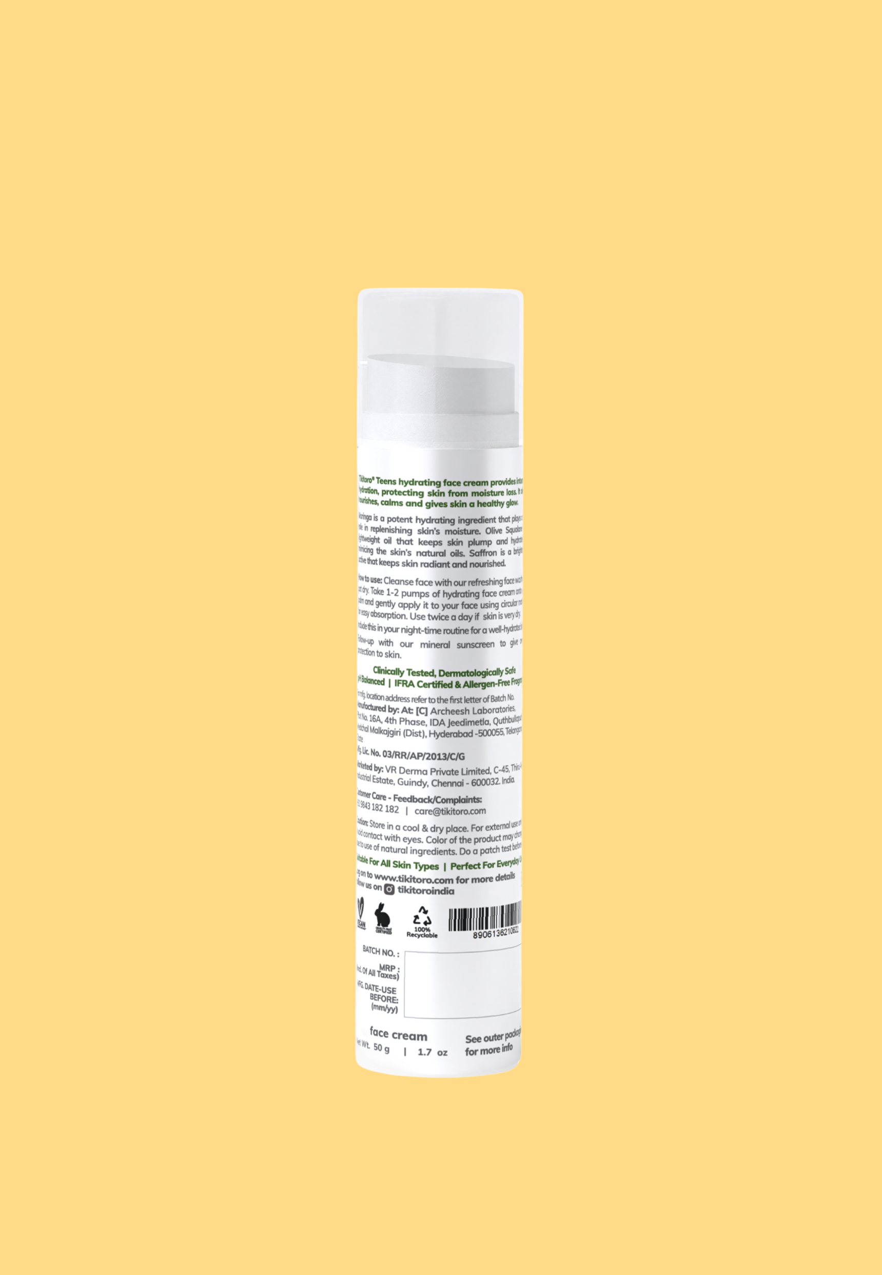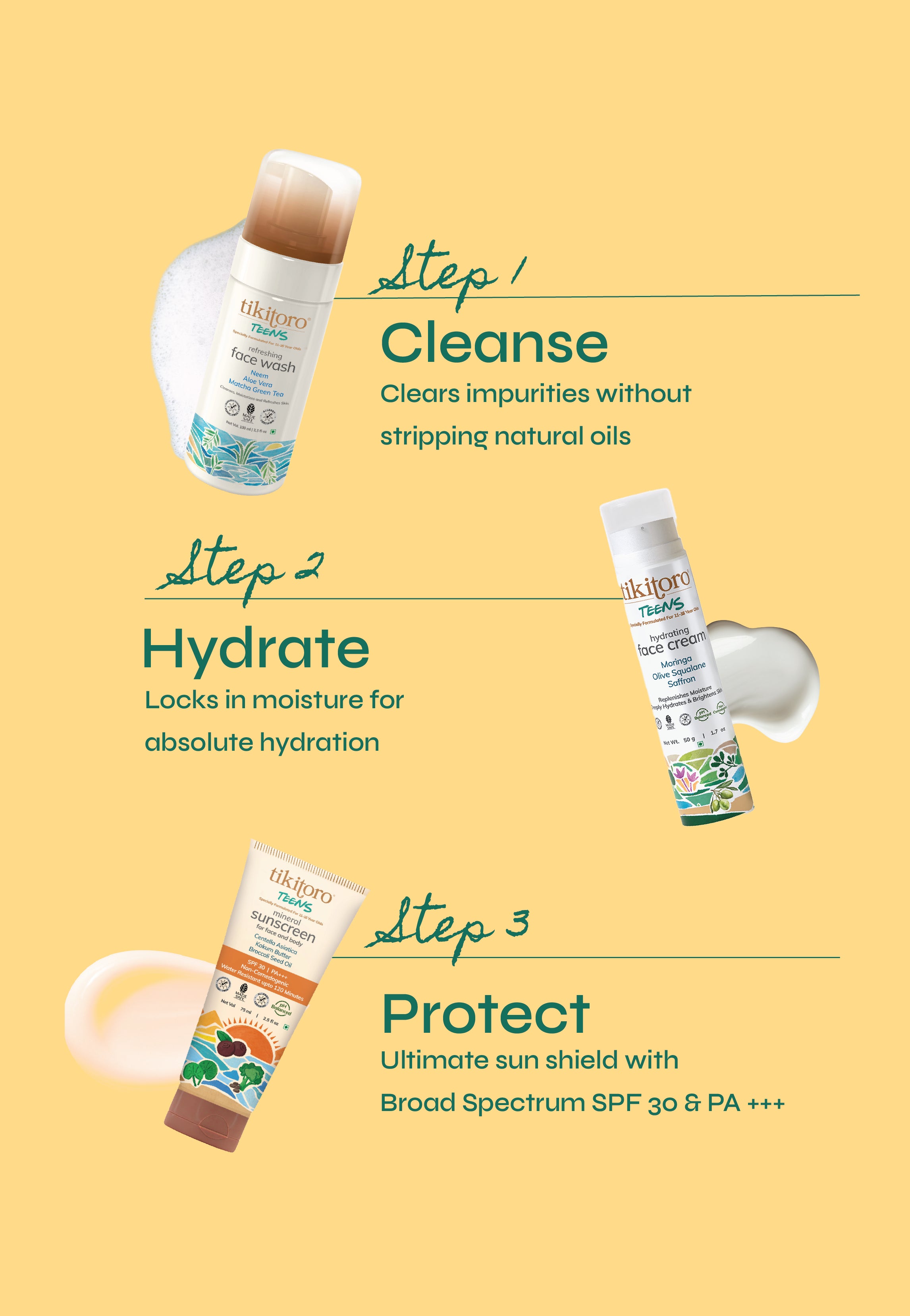 Dry patches? Oily T-zone? Teen skin mood swings? Sorted. Tikitoro Teens Hydrating Face Cream delivers a perfect 24-hour hydration in a feather-light, non-greasy, non-comedogenic formula that sinks in instantly and stays put. Powered by Moringa, Olive Squalane, and Saffron, this face cream for teens strengthens your skin barrier, balances oil, and restores a fresh, confident glow—without clogging pores or feeling heavy. It’s a natural teen face moisturiser that keeps up with classes, sports, screens, and everything in between.
