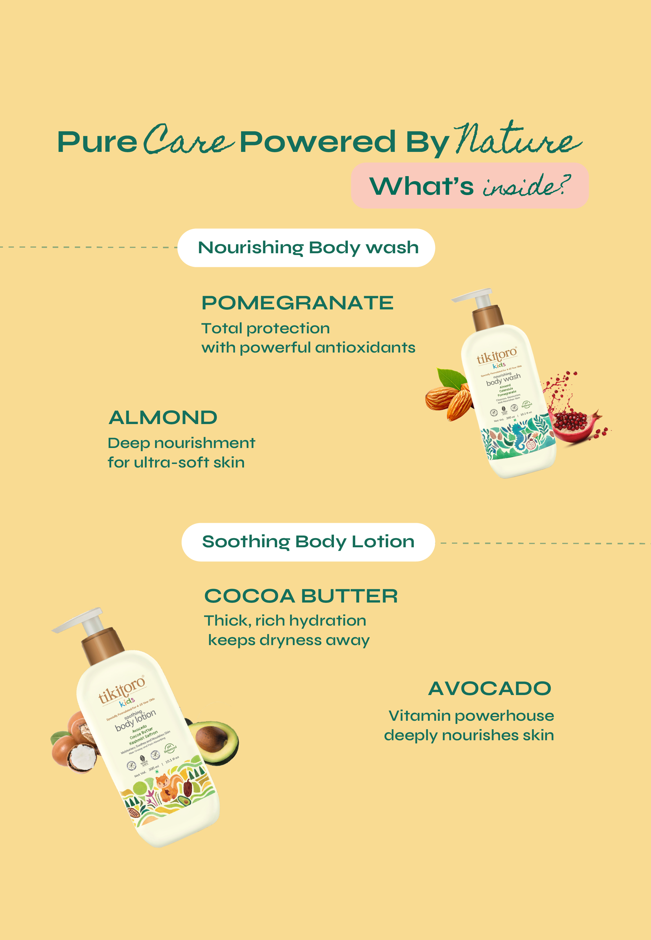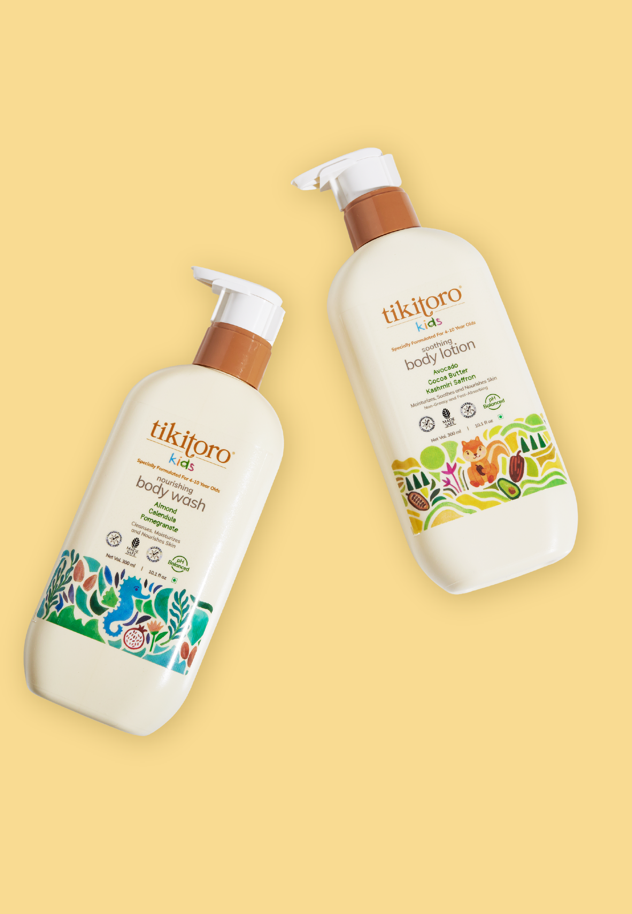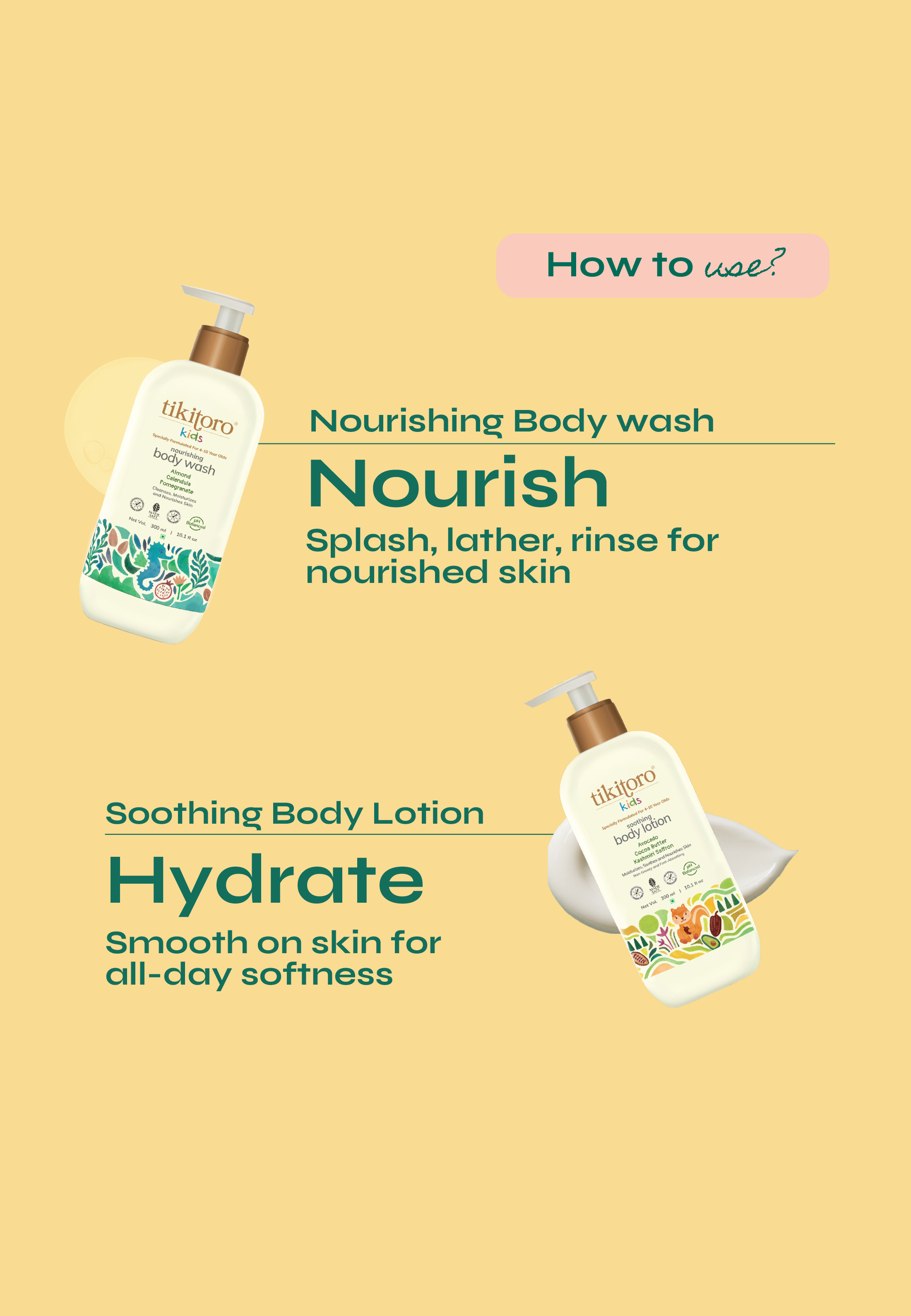 Say goodbye to dryness and dullness, and hello to soft, nourished skin with Tikitoro Kids Body Combo – the Kids Nourishing Body Wash and Kids Hydrating Body Lotion! This power duo works together to cleanse gently and lock in moisture, keeping skin fresh, hydrated, and glowing. Bath time has never been this refreshing—or this fun!