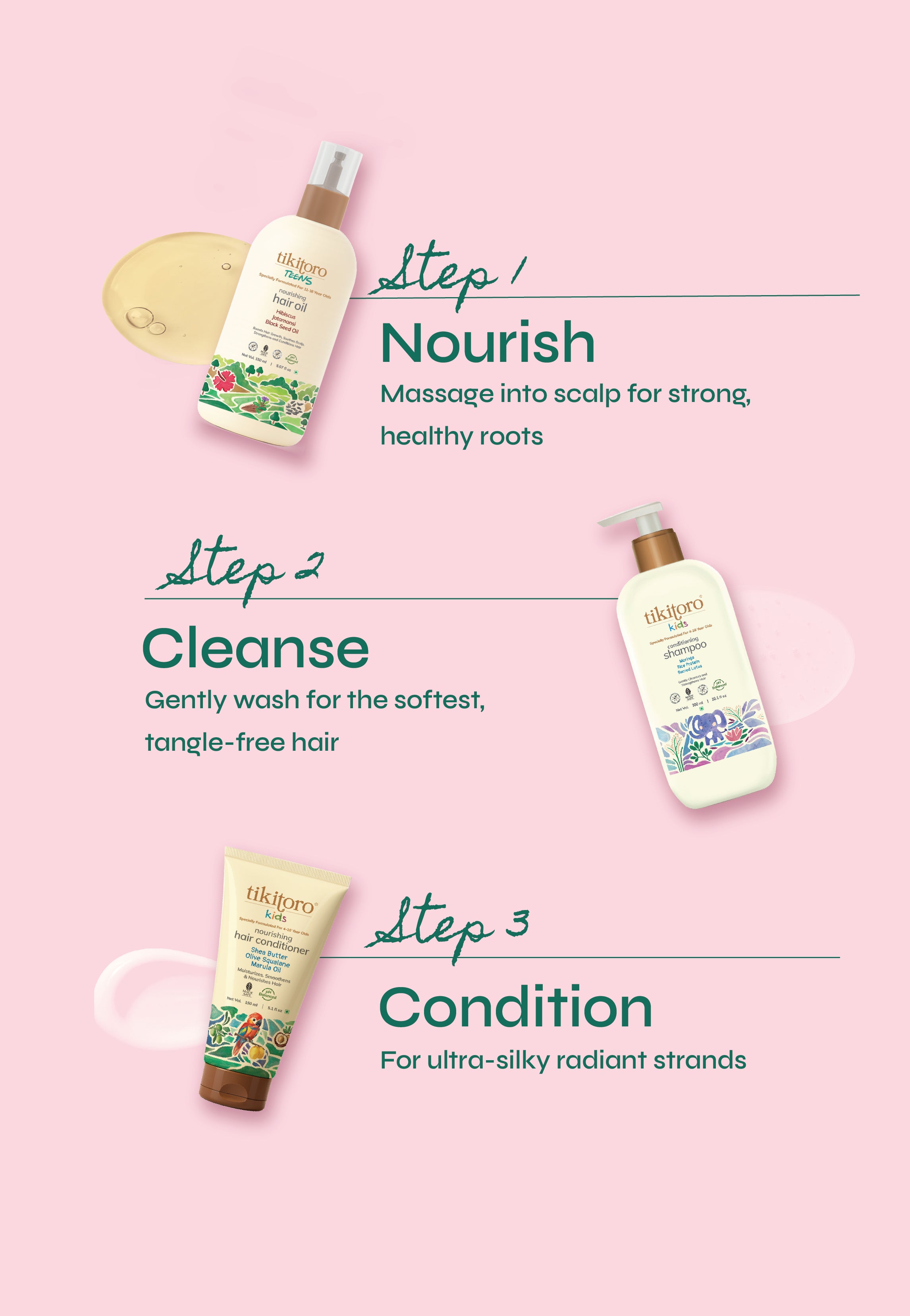 Wash off with tikitoro kids conditioning shampoo for super strong bouncy hair and follow with our kids nourishing hair conditioner for silky smooth and 100% tangle-free hair