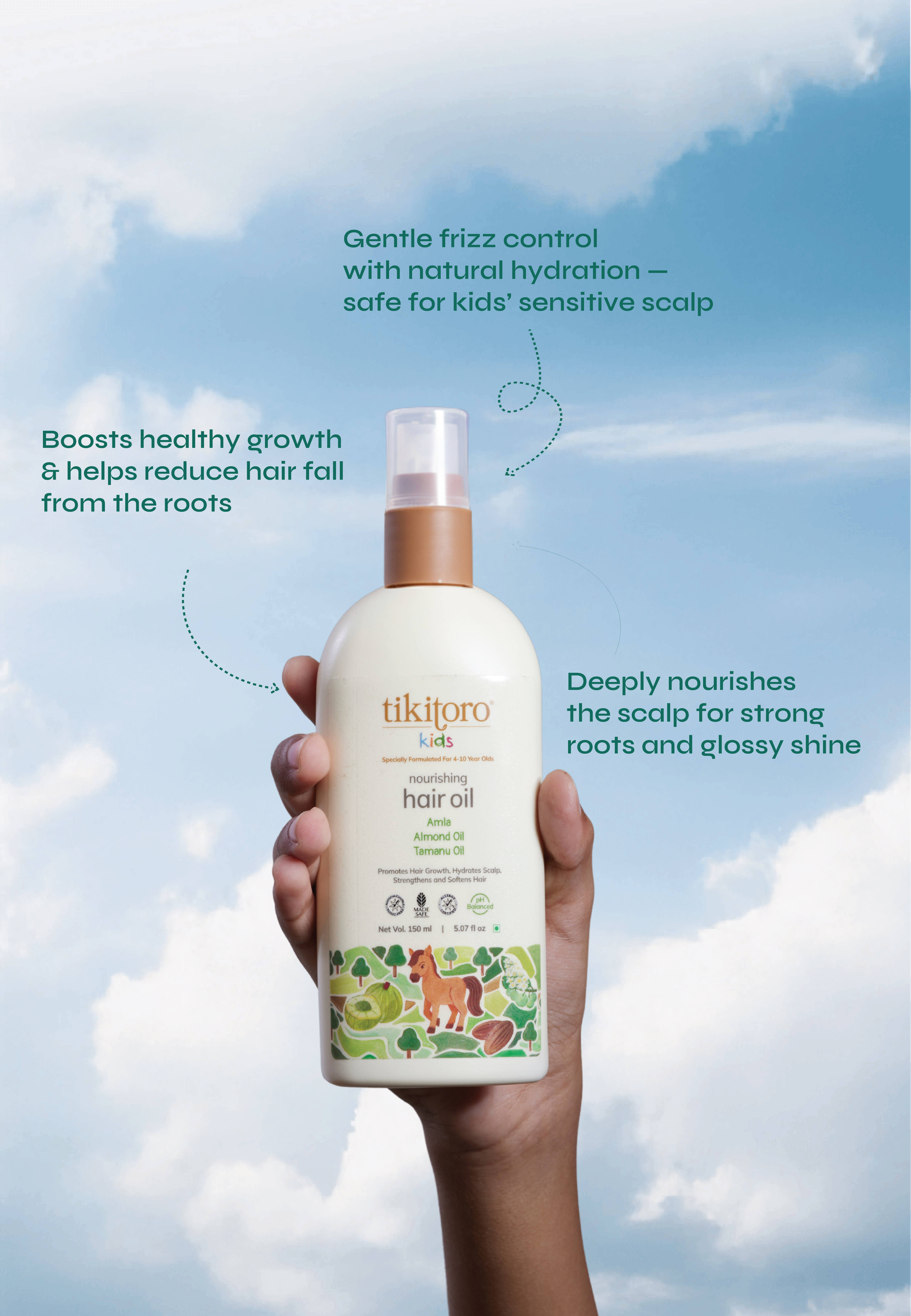 Tikitoro Kids Nourishing Hair Oil is a root-to-tip rescue for little manes. This kids nourishing hair oil combines Amla, Almond Oil, and Tamanu Oil to fuel healthy growth, prevent hair fall, strengthen the strands and add natural shine. With deep scalp hydration and ultimate frizz control, this df makes hair stronger, smoother, and ready for every adventure — no fuss, just glossy strands.