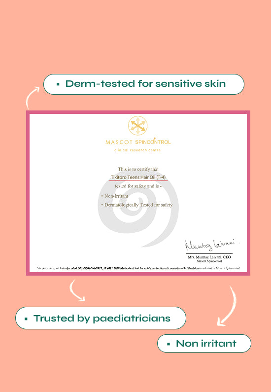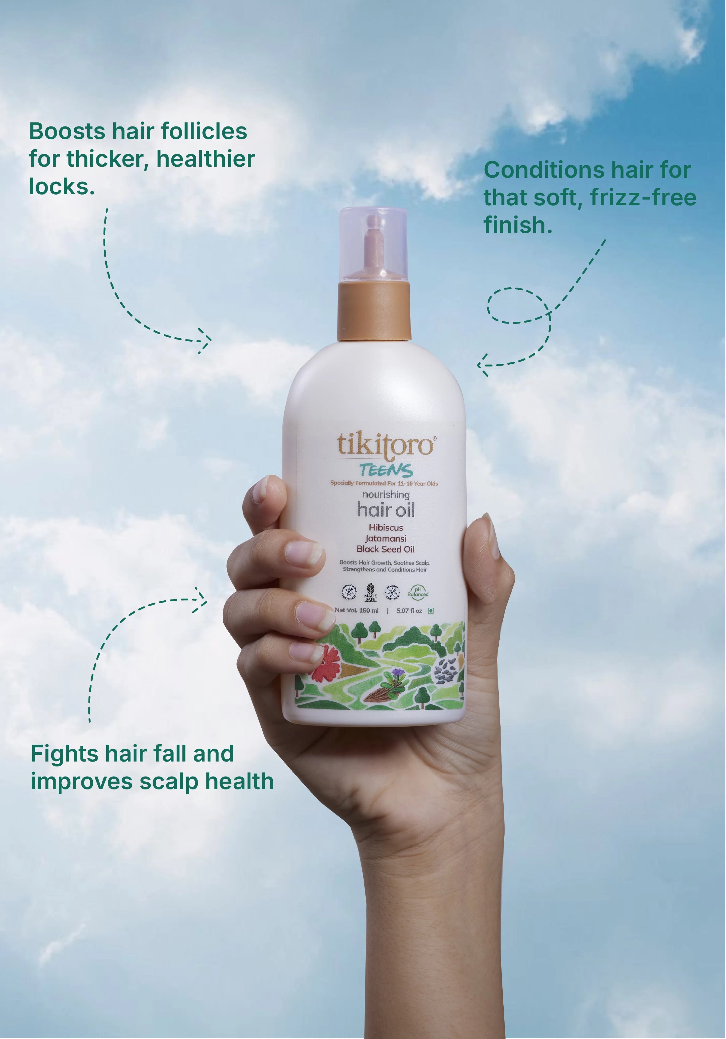 Let your hair do the talking with Tikitoro Teens Nourishing Hair Oil. Designed to tackle hair fall, dryness, and breakage, this hydrating hair oil for teens is the ultimate hair hero. Packed with goodness, this hair oil for teenagers, promotes healthy hair growth, strengthens strands, and leaves your locks shiny, frizz-free, and fabulous. Your scalp and strands are in for some serious TLC!