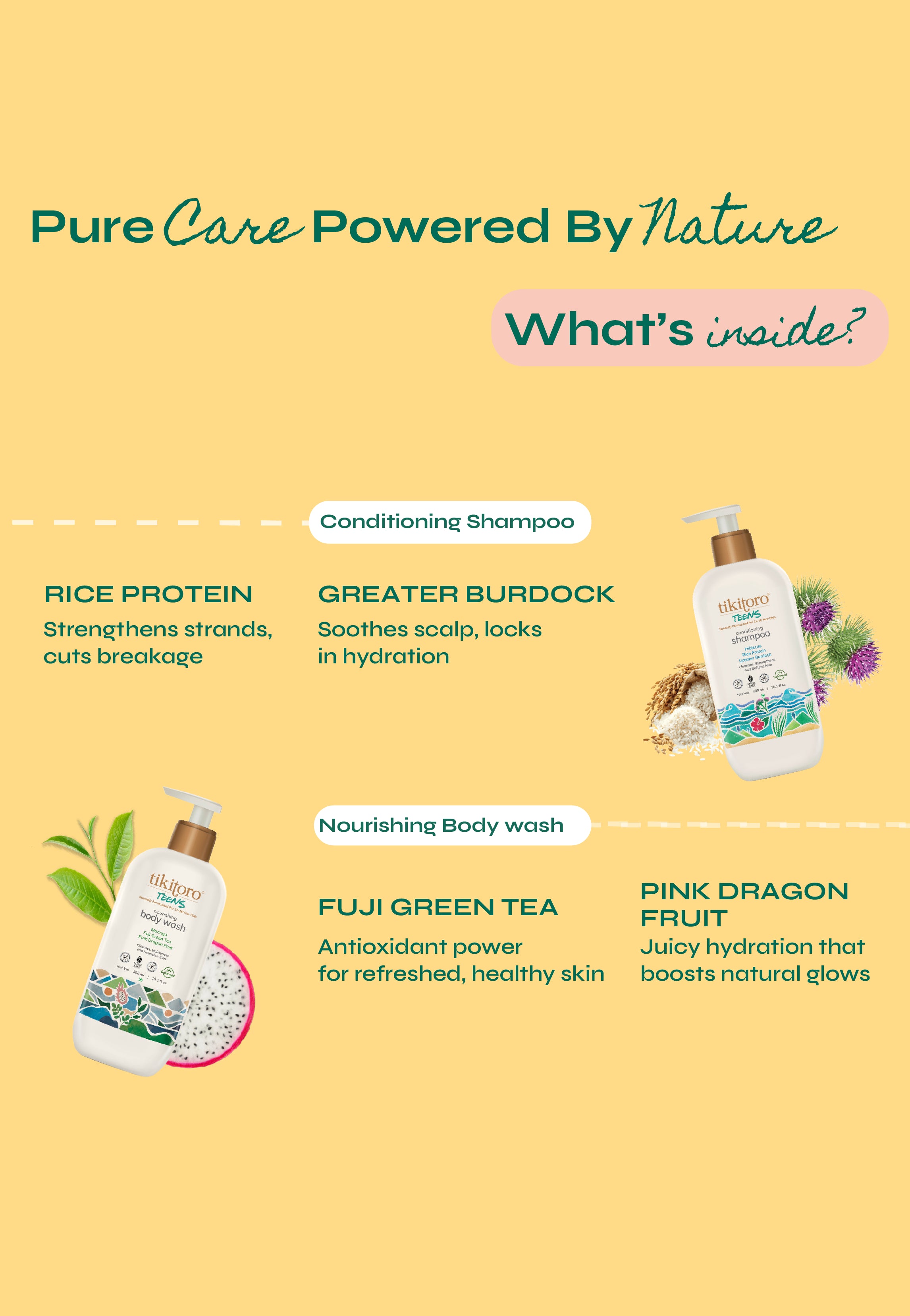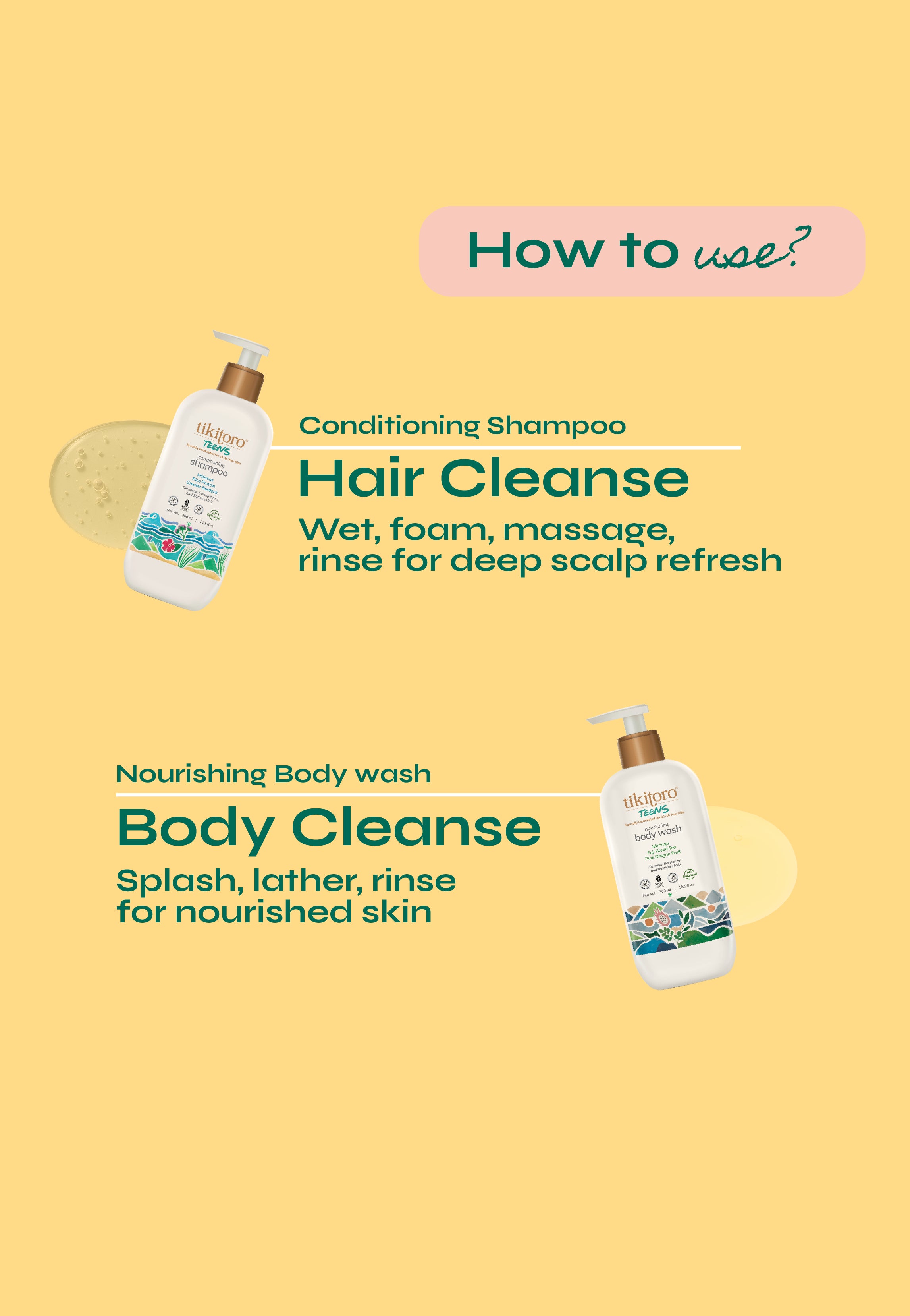 Say goodbye to tangles and tears, and hello to smooth, happy hair and squeaky-clean skin with our Power Duo Tikitoro Teens Daily Essentials Mini Combo – the teens Conditioning Shampoo and teens Nourishing Body Wash! Together, they tackle everyday hair and body woes while preserving precious natural oils, making bath time a joyful win for both you and your little one.