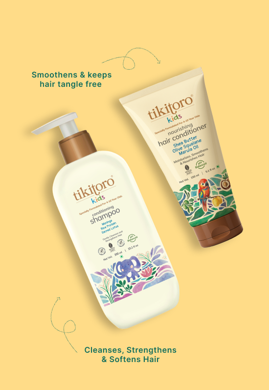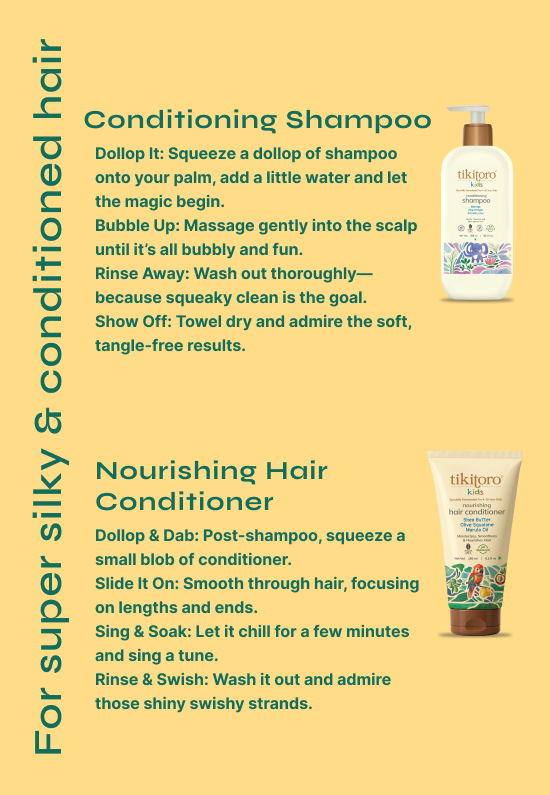 Knots and frizz, meet your match. The Tikitoro Kids Cleanse & Condition Duo is a 2-step routine for silky, happy hair. The Kids Conditioning Shampoo cleans gently while strengthening every strand, and the Kids Hair Conditioner hydrates, detangles, and tames frizz with a creamy, caramel-popcorn-scented finish. Together, they make hair care simple, safe, and swish-ready.