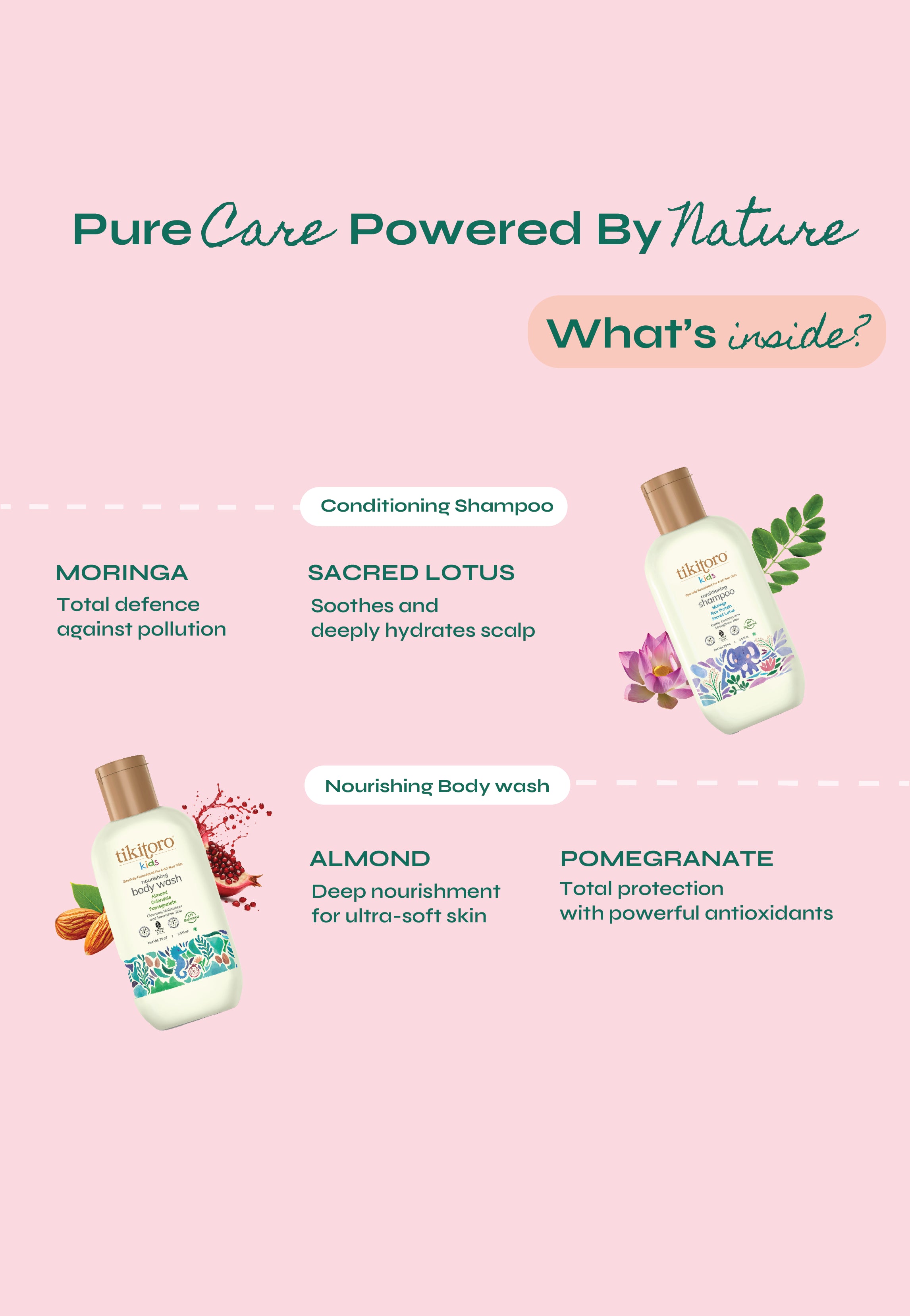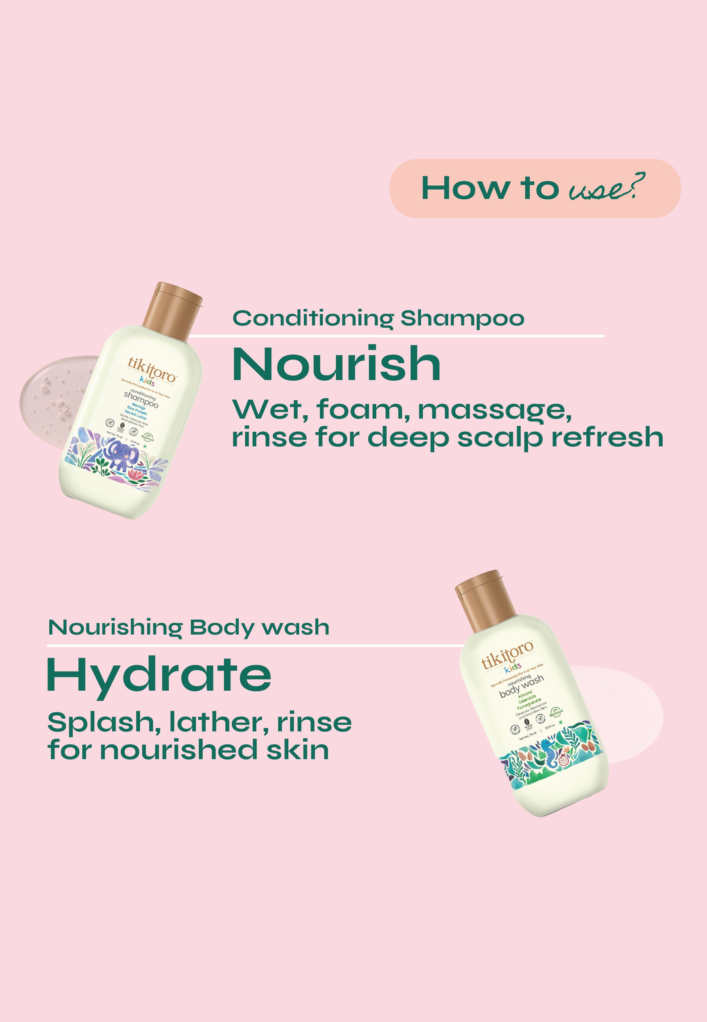 The Tikitoro Kids Daily Essentials Mini Combo is the perfectly sized kids daily essentials mini combo for travel, trials, or tiny bathroom shelves. This compact kids shampoo and body wash mini combo pairs our Kids Nourishing Body Wash with clinically proven hydration and barrier-strengthening care, with our Kids Conditioning Shampoo that delivers stronger hair from the very first wash.