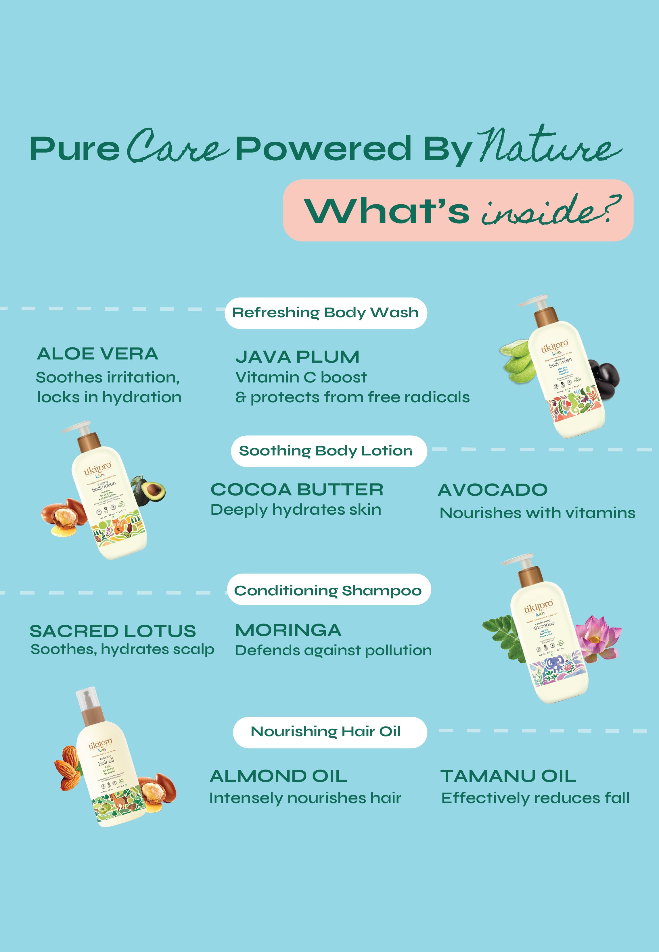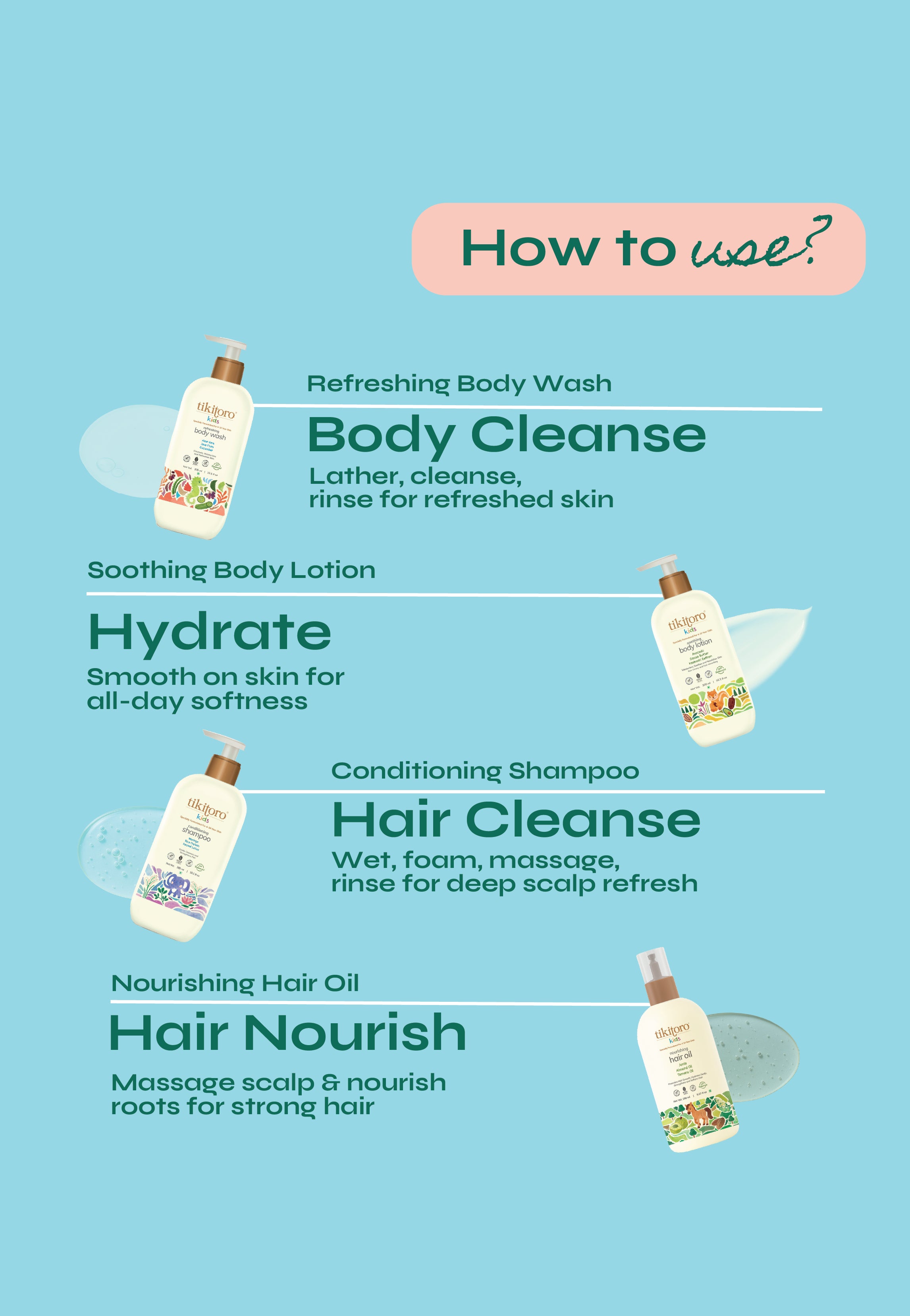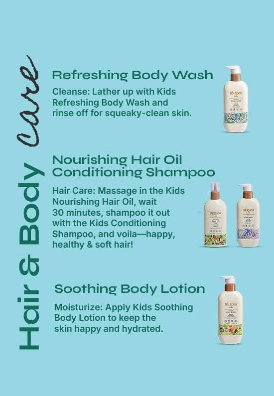 The Tikitoro Kids Gentle Care Combo is the perfect all-in-one set for keeping your little one’s skin and hair healthy and fresh! This essential combo includes everything needed for a complete bath time routine: the Body Wash gently cleanses and hydrates delicate skin, while the Body Lotion locks in moisture for soft, smooth skin all day. The Shampoo keeps hair clean, soft, and tangle-free, and the Hair Oil nourishes and adds shine for stronger, healthier hair. Specially crafted for kids’ skin and hair, this combo makes bath time fun, easy, and effective!