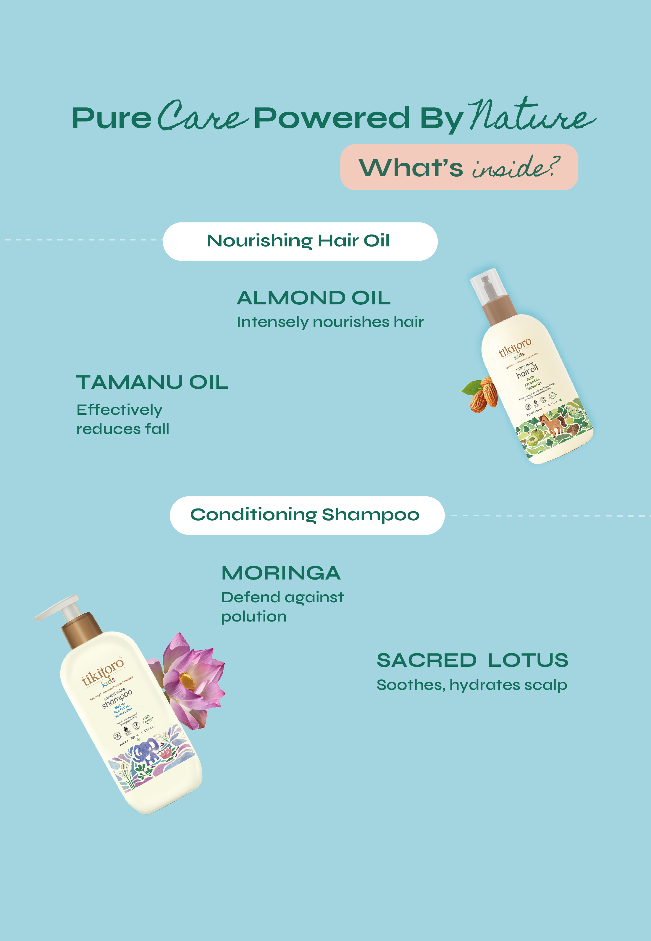 From messy hair to silky strands (and everything in between), the Tikitoro Hair Care Combo is here to make hair care a breeze! Start with the Kids Nourishing Hair Oil, packed with nutrients to strengthen hair from root to tip, leaving it shiny, smooth, and healthy. Follow it up with the Kids Conditioning Shampoo, specially designed for gentle cleansing and effortless detangling, ensuring every wash leaves their hair soft, happy, and full of bounce. Taking care of your little one's locks has never been this simple—or this fun!