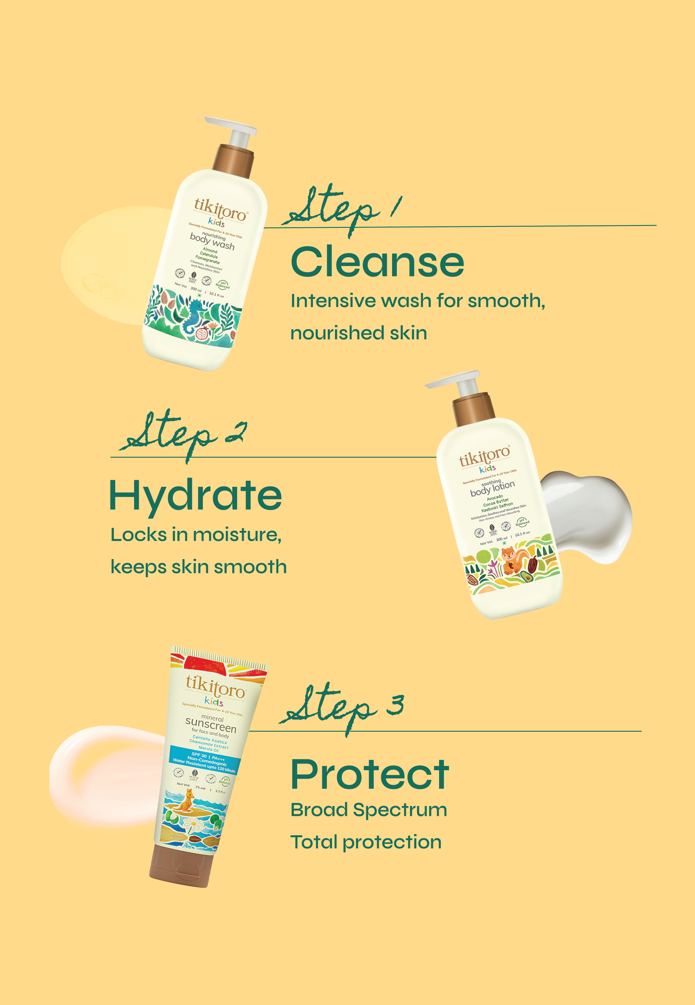 Make bath time the best time with Tikitoro’s kids body wash for soft skin! This gentle, nourishing kids body care product cleanses away dirt and grime while keeping their skin hydrated, calm, and oh-so-soft. Plus, it’s tough enough to handle muddy knees and paint-smeared arms, making it a must-have for every adventure-filled day.