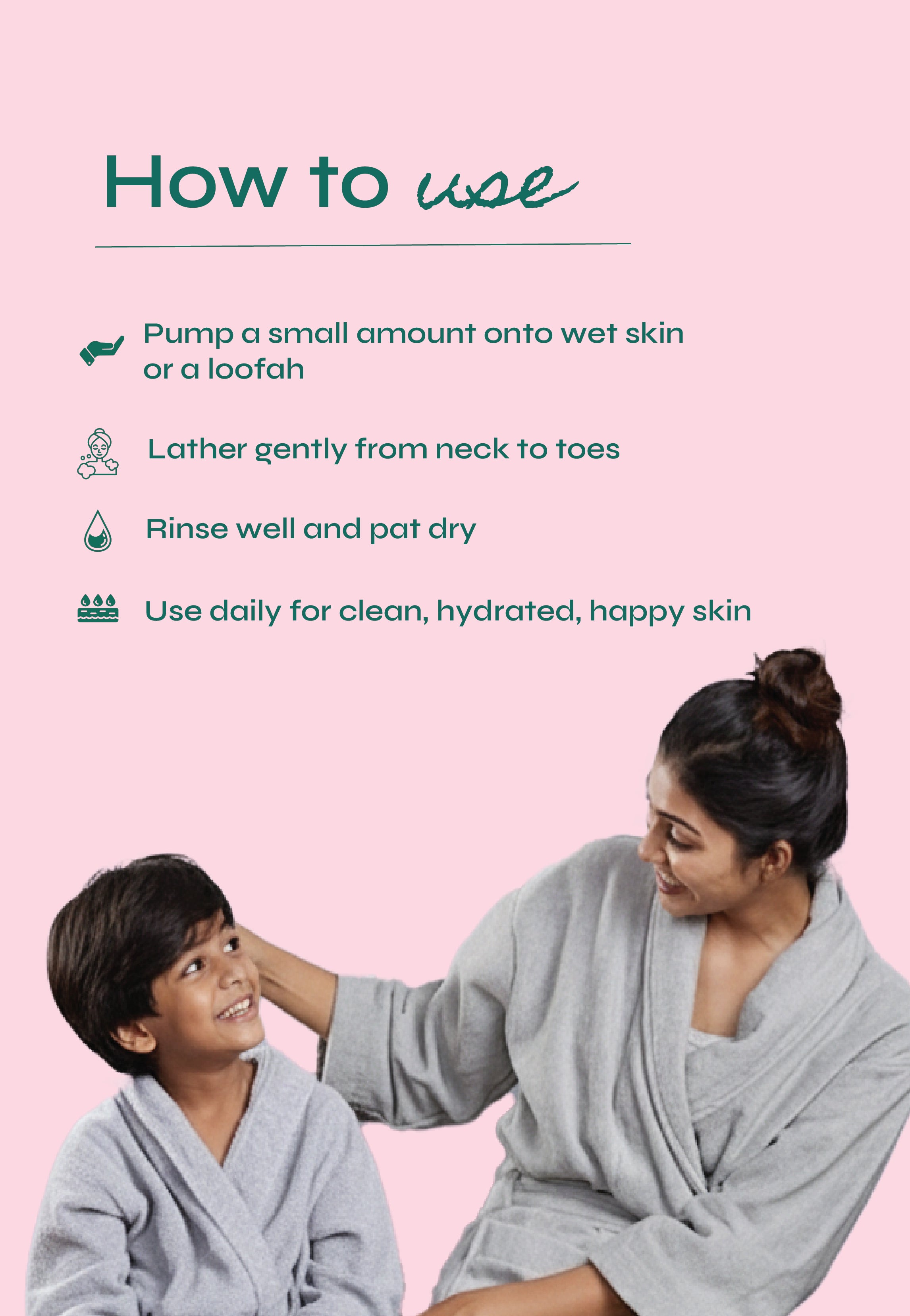 And it is super easy to use! Just wet your child’s skin with warm water, pour a small amount of body wash onto a soft washcloth or your hands and gently lather and massage it onto the skin. Let your child enjoy the fragrant lather before rinsing it off with warm water and patting the skin dry. Do remember to apply our kids body lotion liberally over the body, after every bath!