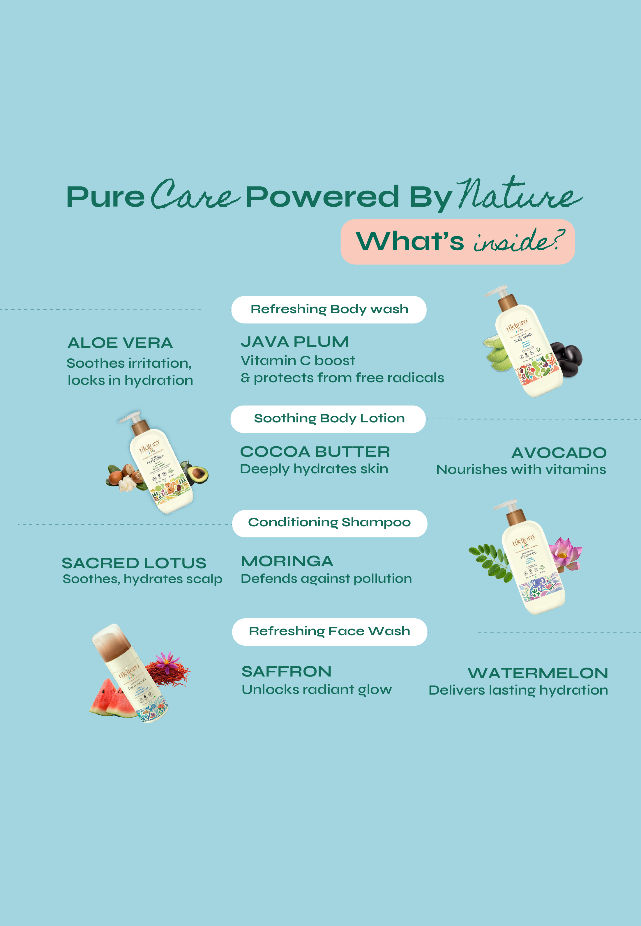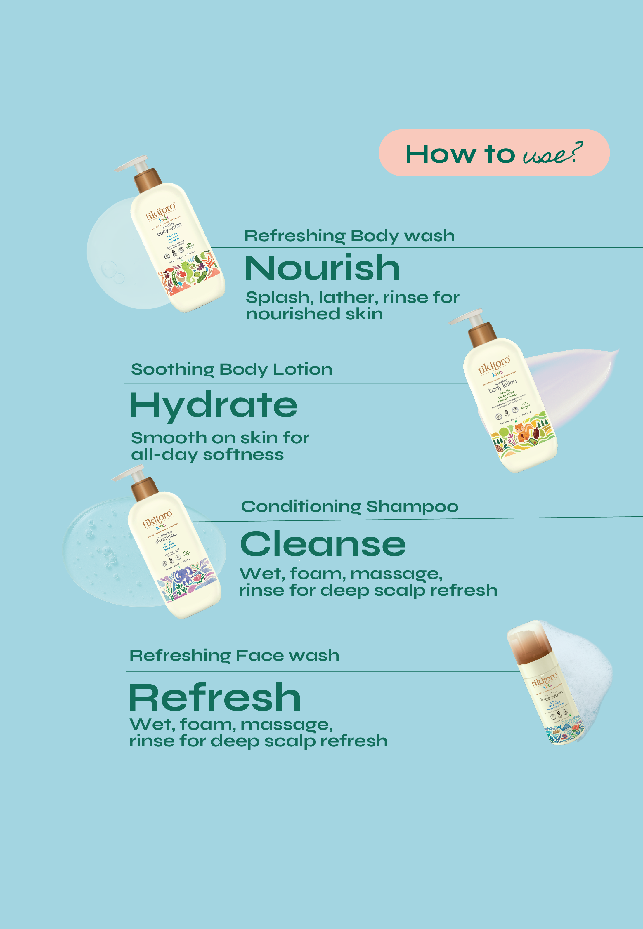 Get your little ones ready for a full-body glow-up with the Tikitoro Kids Super Care Combo! This head-to-toe care package brings together the ultimate dream team: Kids Refreshing Body Wash for squeaky-clean skin, Kids Soothing Body Lotion for all-day hydration, Kids Conditioning Shampoo for soft, tangle-free hair, and Kids Refreshing Face Wash for a fresh, happy face. This kids super care combo pack is designed to keep kids feeling pampered and looking their best, this combo is gentle, effective, and bursting with fun.