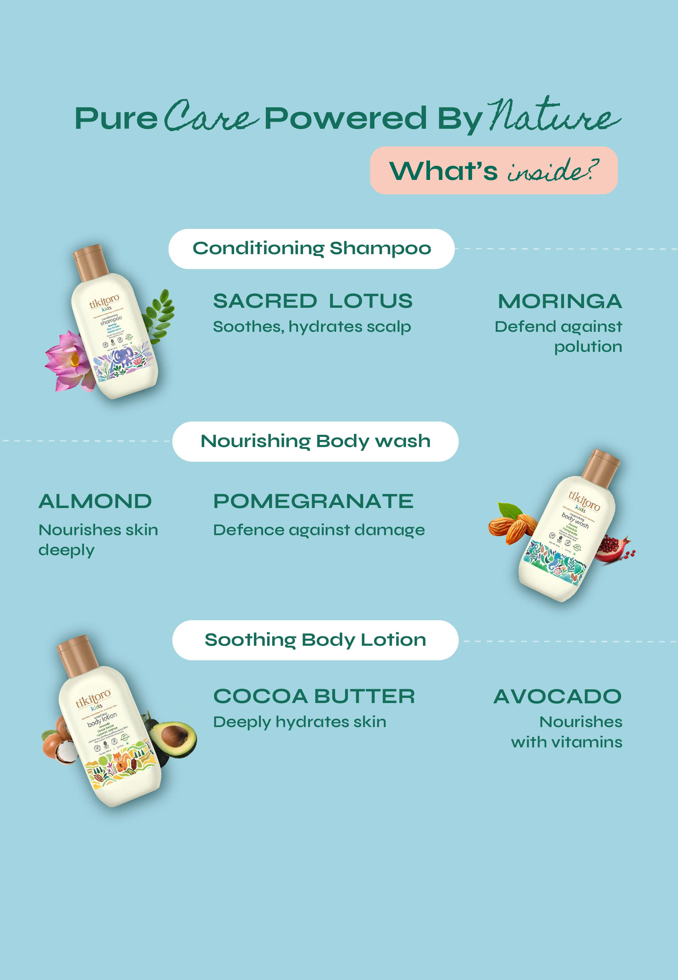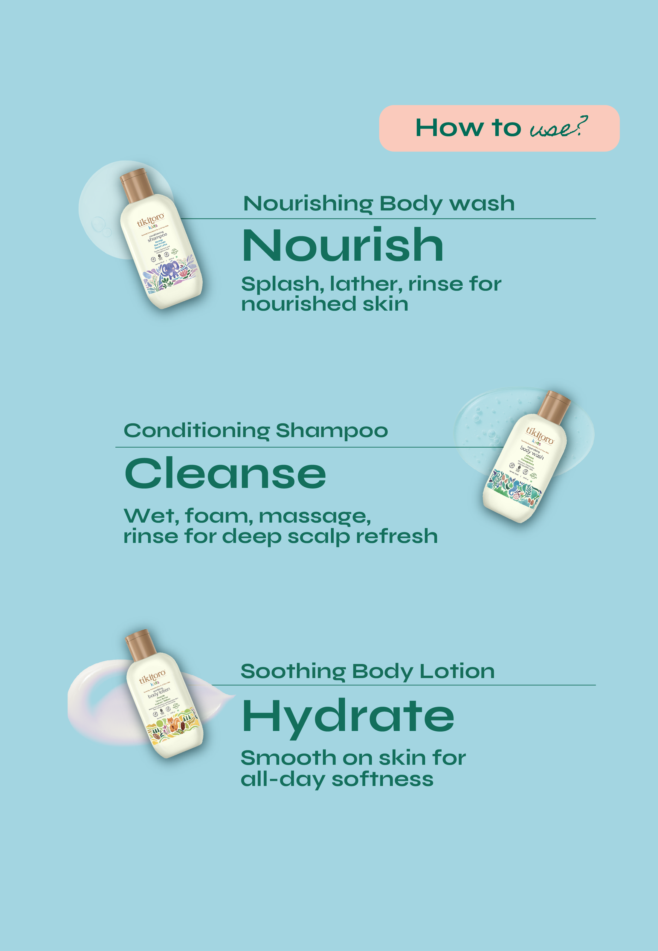 Say hello to fuss-free travel with the Tikitoro Kids Travel Kit. This handy trio packs all the essentials your little one needs for a head-to-toe refresh while on the go. Start with Kids Nourishing Body Wash for a bubbly, gentle cleanse, then use Kids Conditioning Shampoo for silky-smooth hair. Finish with Kids Soothing Body Lotion to lock in hydration and keep their skin soft and happy. Compact, convenient, and made for adventure—this travel kit makes self-care a breeze, no matter where you roam.
