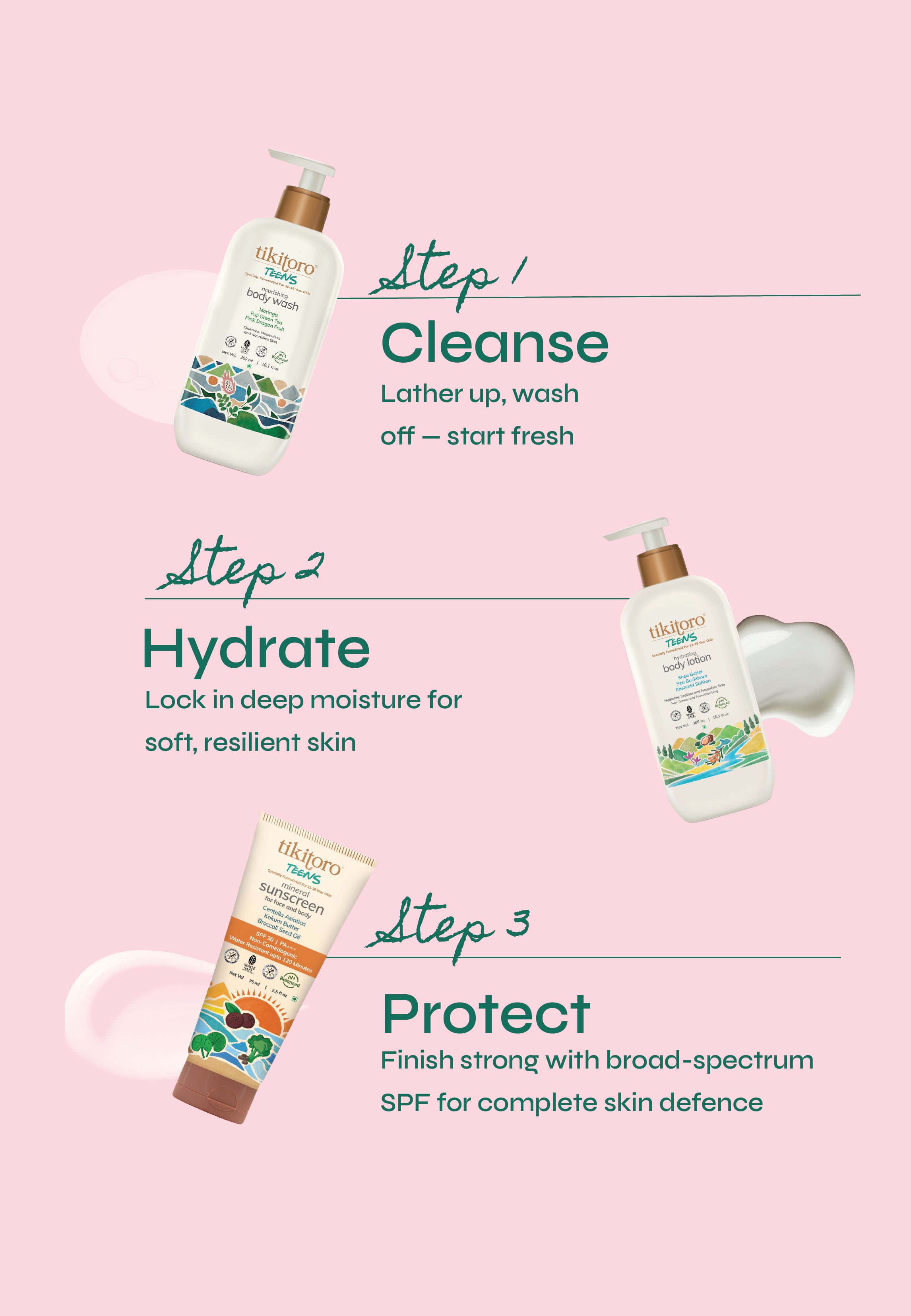 Dull skin? Daily grime? Patchy skin plotting against you? Cancel it all. Tikitoro Teens Nourishing Body Wash is a moisturizing body wash for teens that hits refresh on your shower game. With Moringa, Fuji Green Tea, and Pink Dragon Fruit, it fuels 24-hrs* hydration, protects against pollutants, and keeps odour in check. This is more than just a hydrating body cleanser — it’s your triple-action shield for soft, strong, fresh skin every single day.