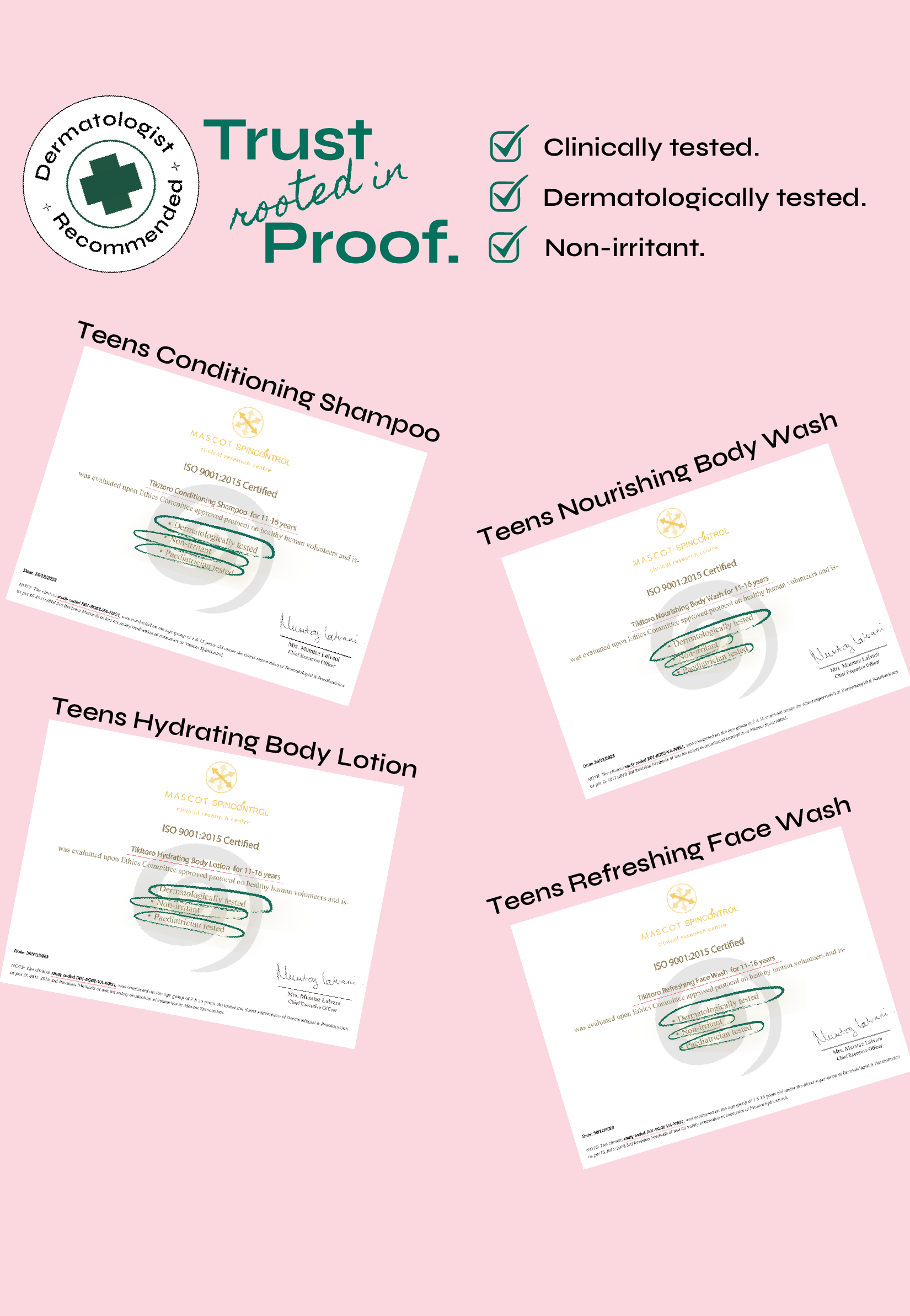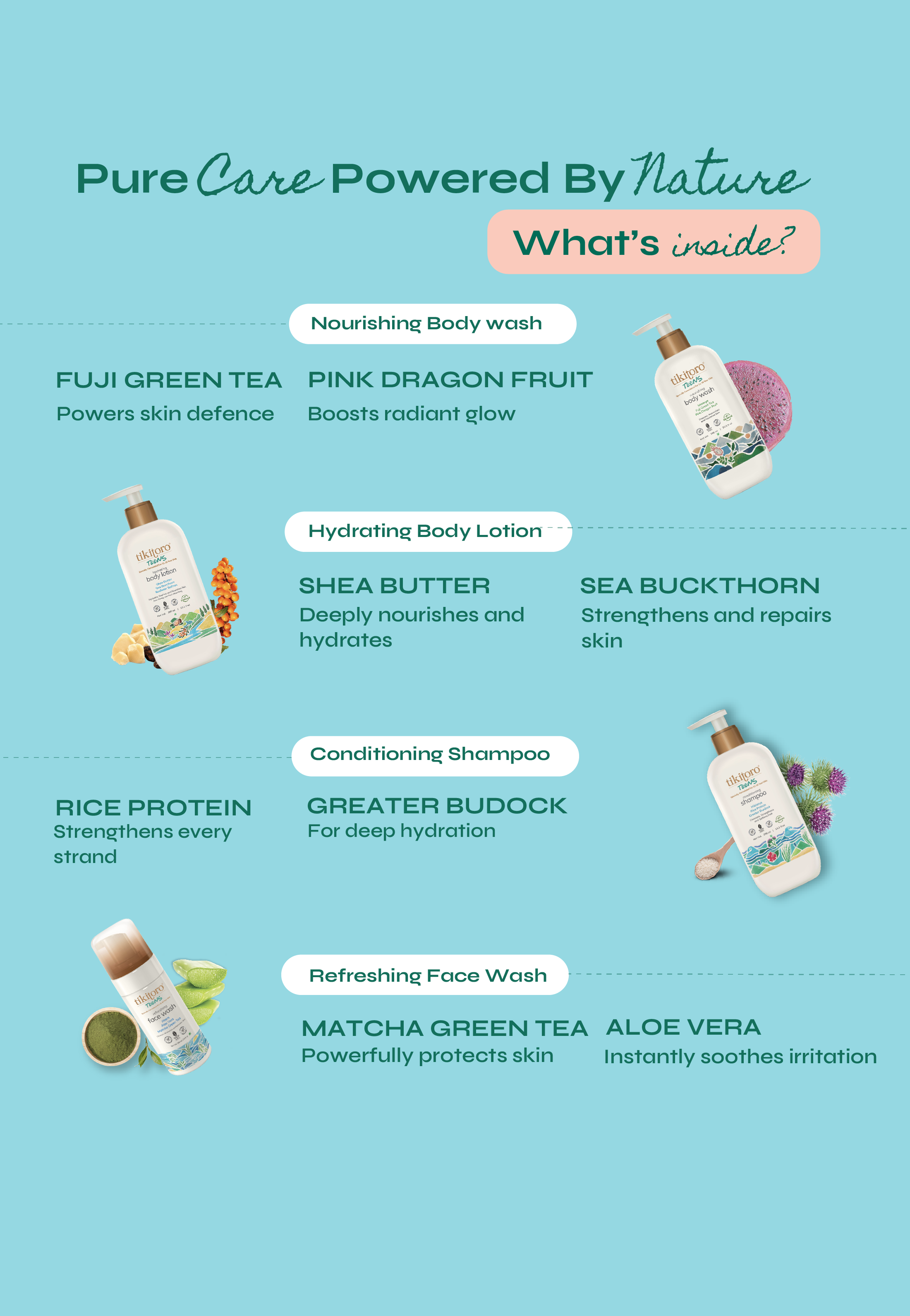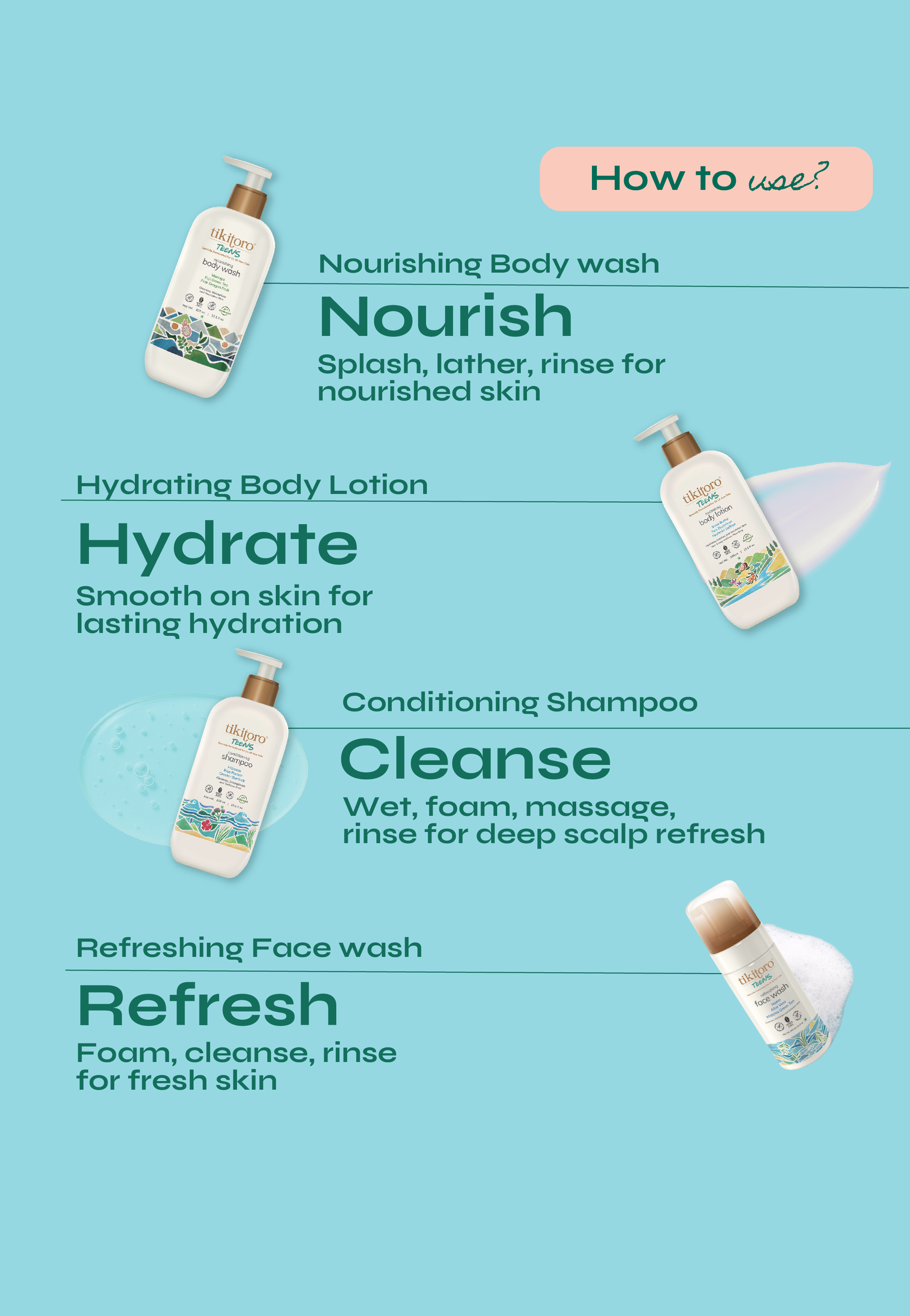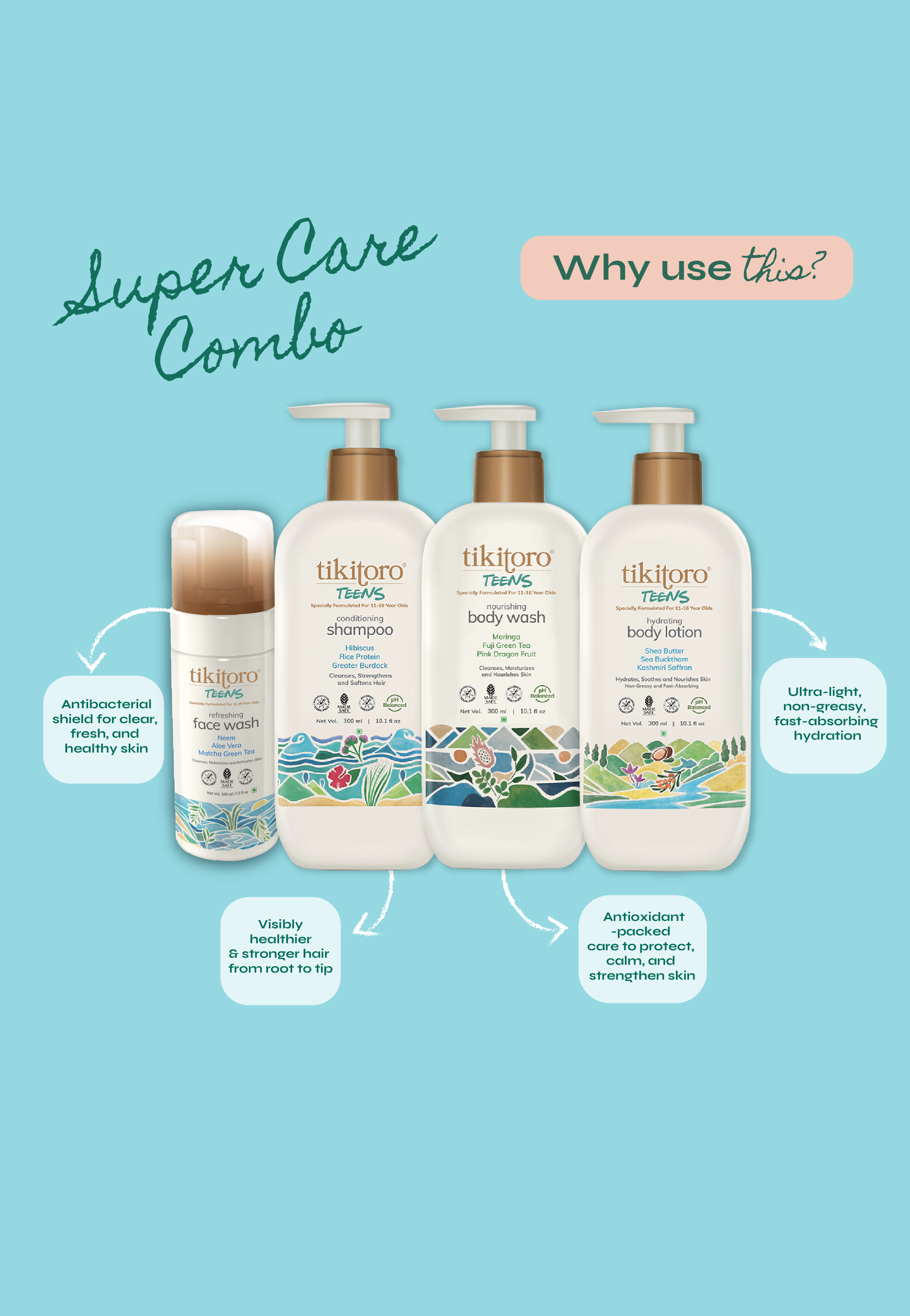 Glow up, freshen up, and power up your personal care game with the Tikitoro Teens Super Care Combo. Packed with all the essentials, this is your ultimate teen deluxe grooming set for glowing skin, great hair, and everything in between. Start with Teens Nourishing Body Wash for a shower that’s all about clean, hydrated skin. Use Teens Conditioning Shampoo for healthy, swish-worthy hair. Follow up with Teens Refreshing Face Wash to keep your face glowing, oil-free, and selfie-ready. Finish with Teens Hydrating Body Lotion for soft, smooth, and happy vibes all day long. It’s everything you need to nail the perfect head-to-toe routine—easy, breezy, and totally Tikitoro.