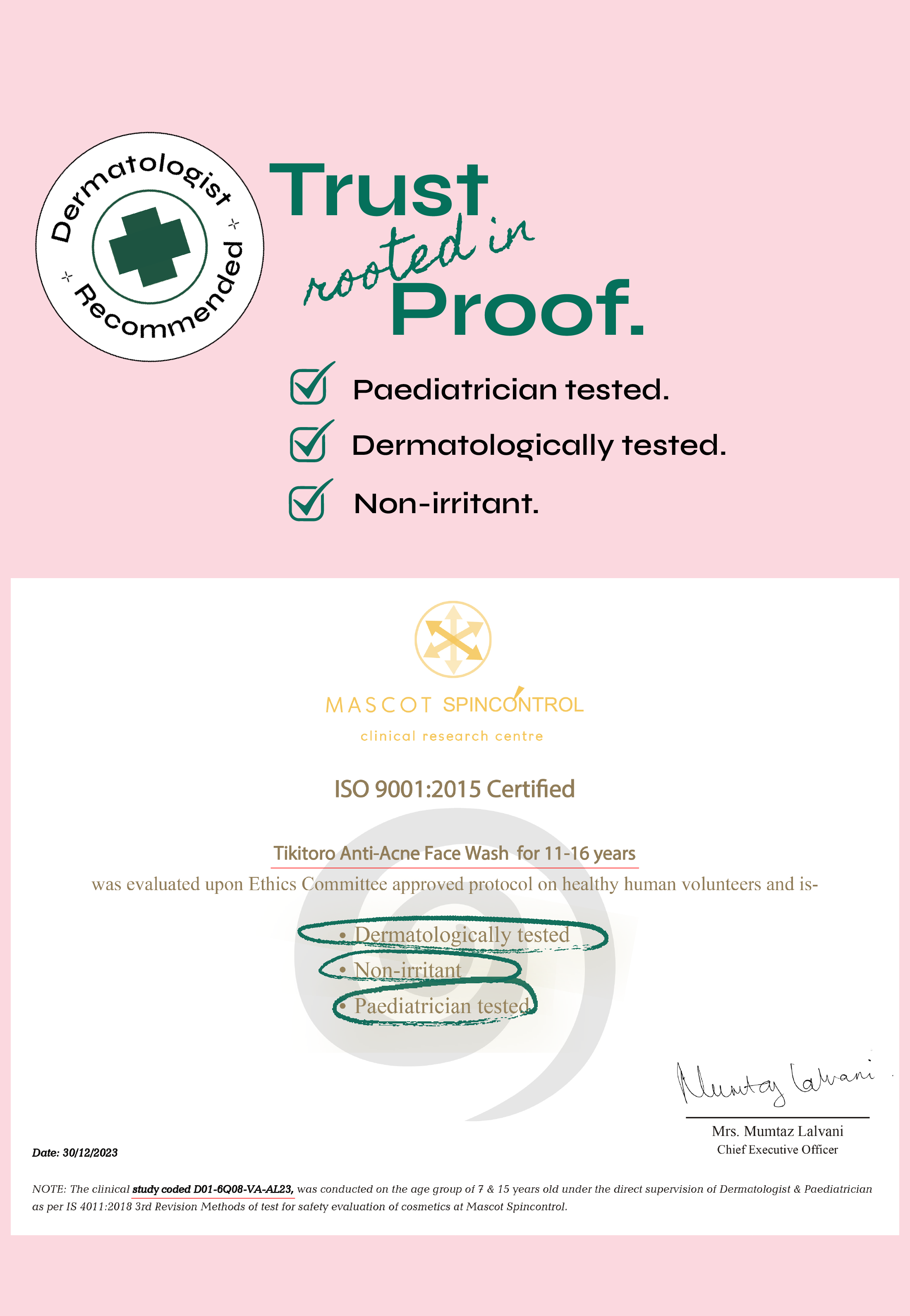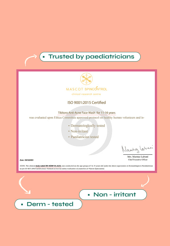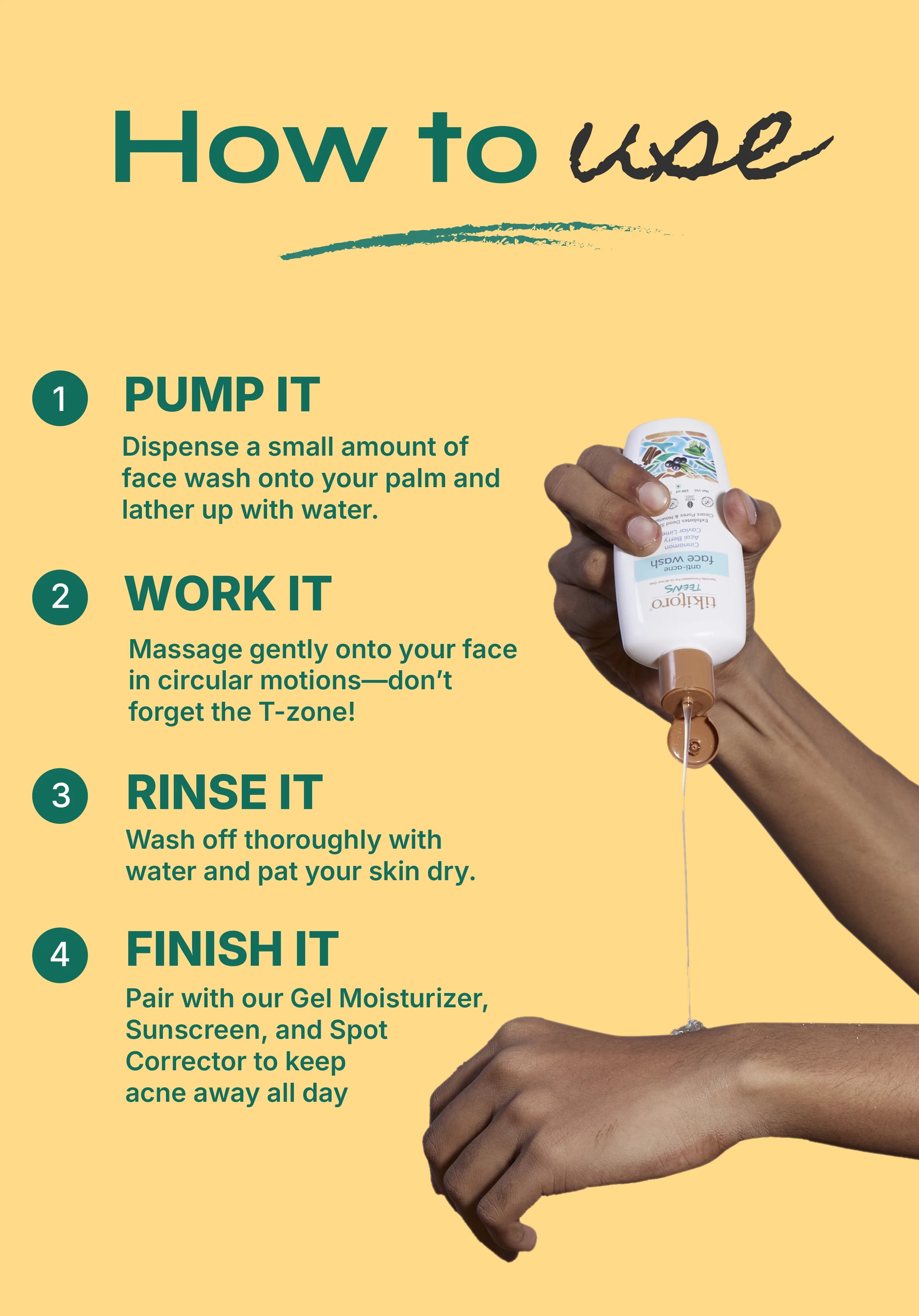 Zap those zits with Tikitoro Teens Anti-Acne Face Wash! This acne-fighting powerhouse is here to cleanse, hydrate, and calm your skin while showing pesky pimples the door. Whether it’s clogged pores, redness, or an unwelcome breakout, this gentle anti-acne cleanser for teenagers has your back (and your T-zone). Get ready to flaunt brighter, smoother skin that feels fresh and clean, without stripping away your natural oils. Pair it with our Gel Moisturizer and Spot Corrector for a complete skincare routine that keeps acne at bay and confidence sky-high.