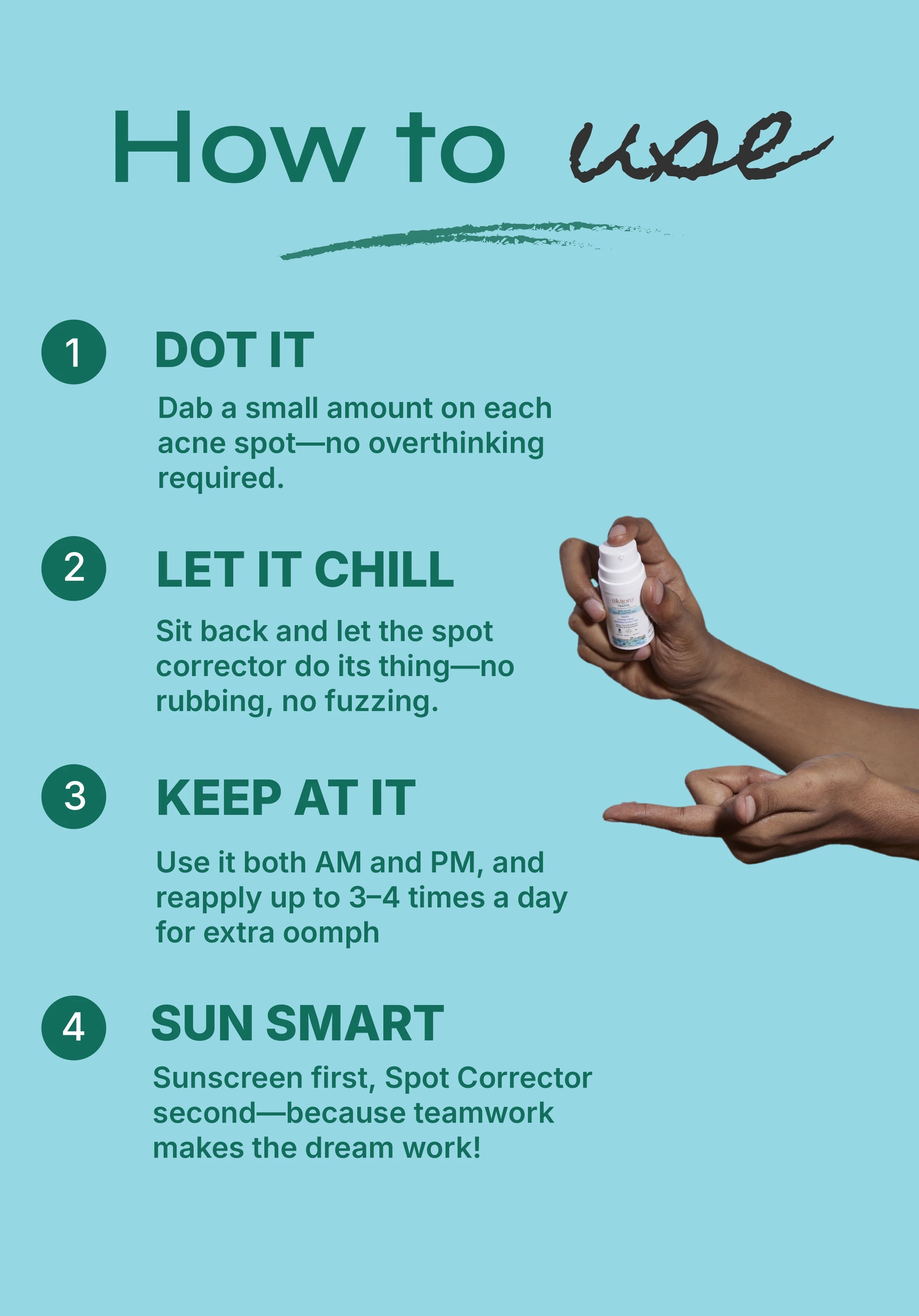 Apply tiny dots directly on the acne spots—precision is key! On first use, you might feel a slight tingle—that’s the spot corrector getting to work.