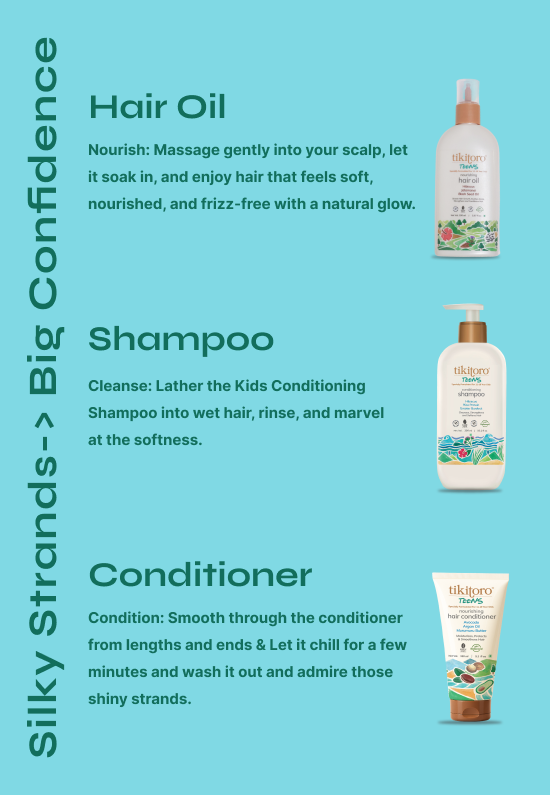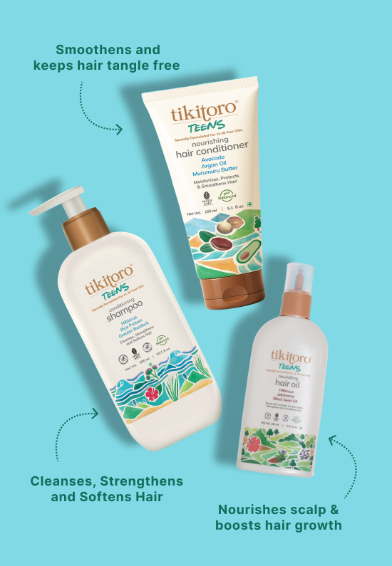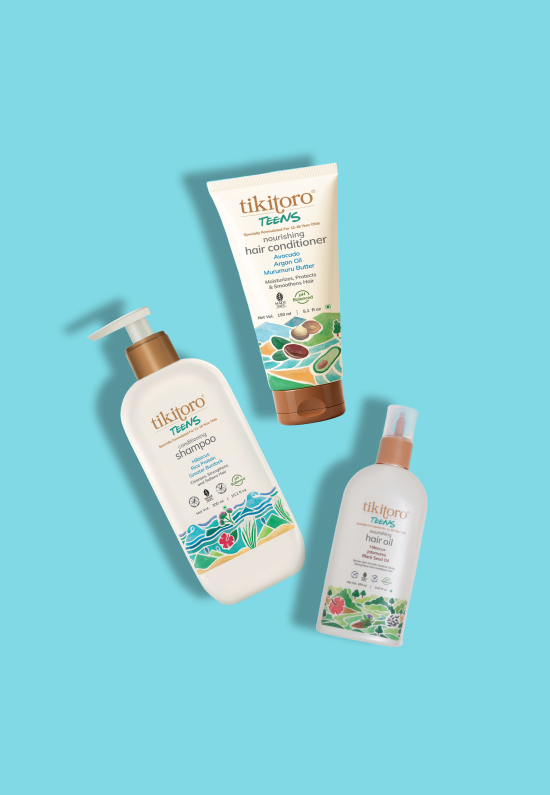 Bad hair days? Cancelled. The Tikitoro Teens Complete Hair Combo is a 3-step ritual for glossy, healthy hair. Teens Nourishing Hair Oil fuels growth and fights fall, Teens Conditioning Shampoo strengthens while it cleans, and Teens Hair Conditioner tames frizz and detangles with ease. Simple, fuss-free, and selfie-ready — for hair that looks good, feels good, and behaves.